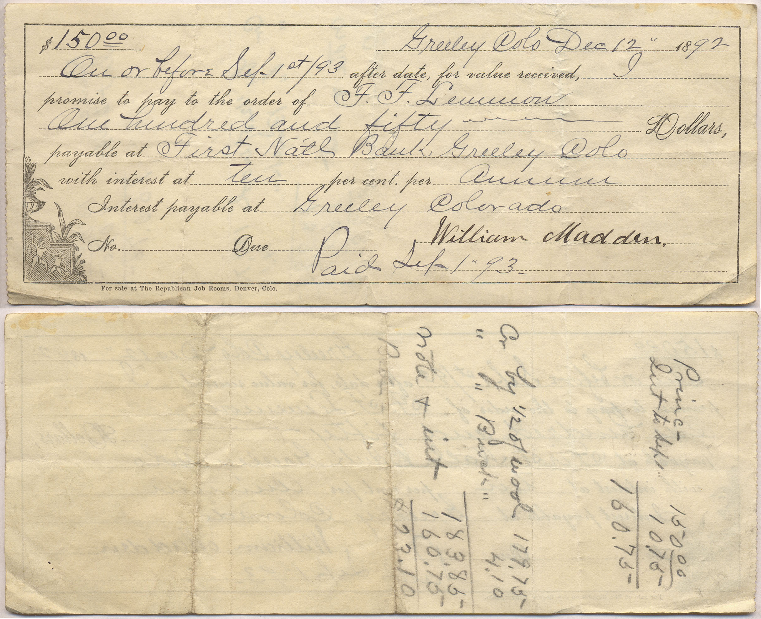 A 1892 balance for $150.00 paid by William Madden on September 1, 1893 at the First National Bank in Greeley, Colorado with calculations on the back. William and his brother Charles along with family in Iowa were investing in Fort Morgan real estate together. |