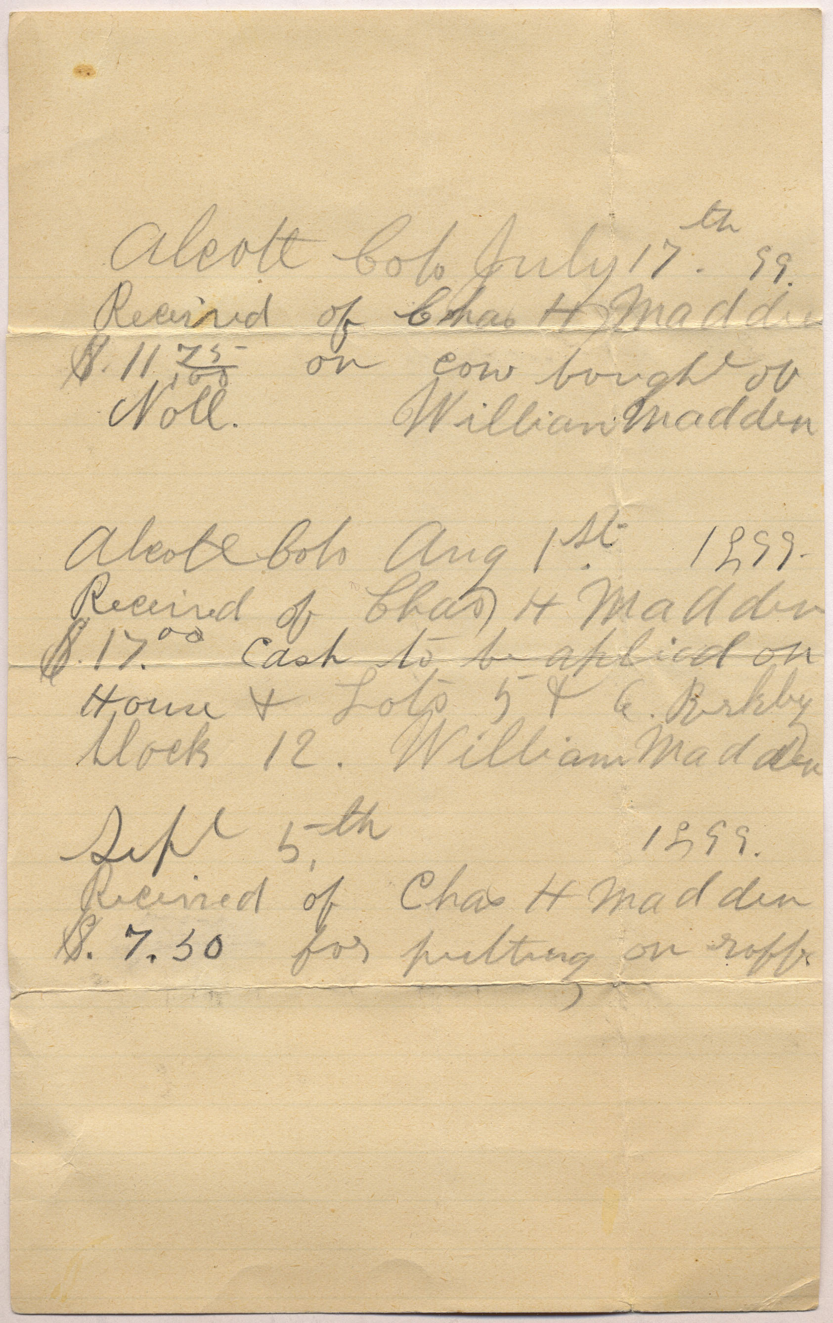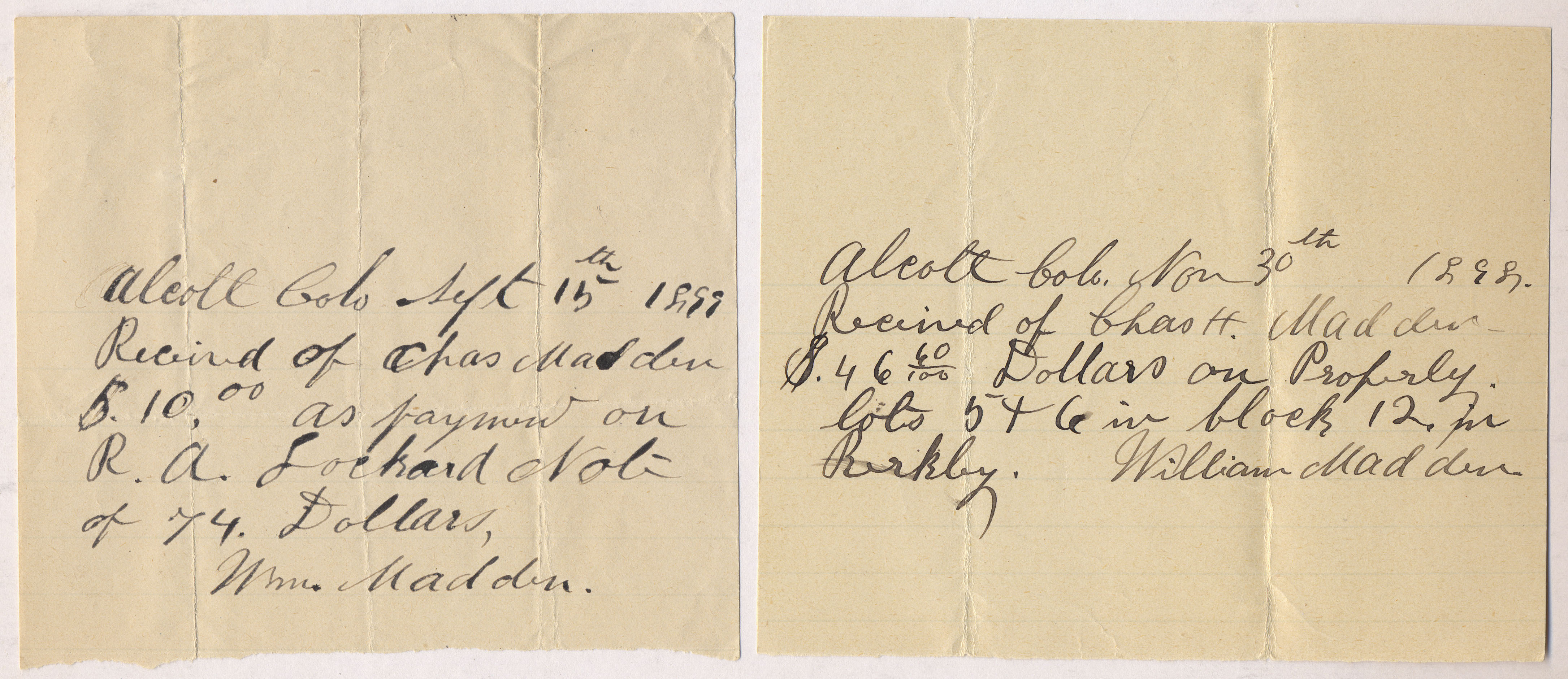 1899 receipts from Charles and his brother William Madden for a cow, house lots 5 & 6 in Berkley and new house roof in Alcott, Colorado, before they moved to Brighton.