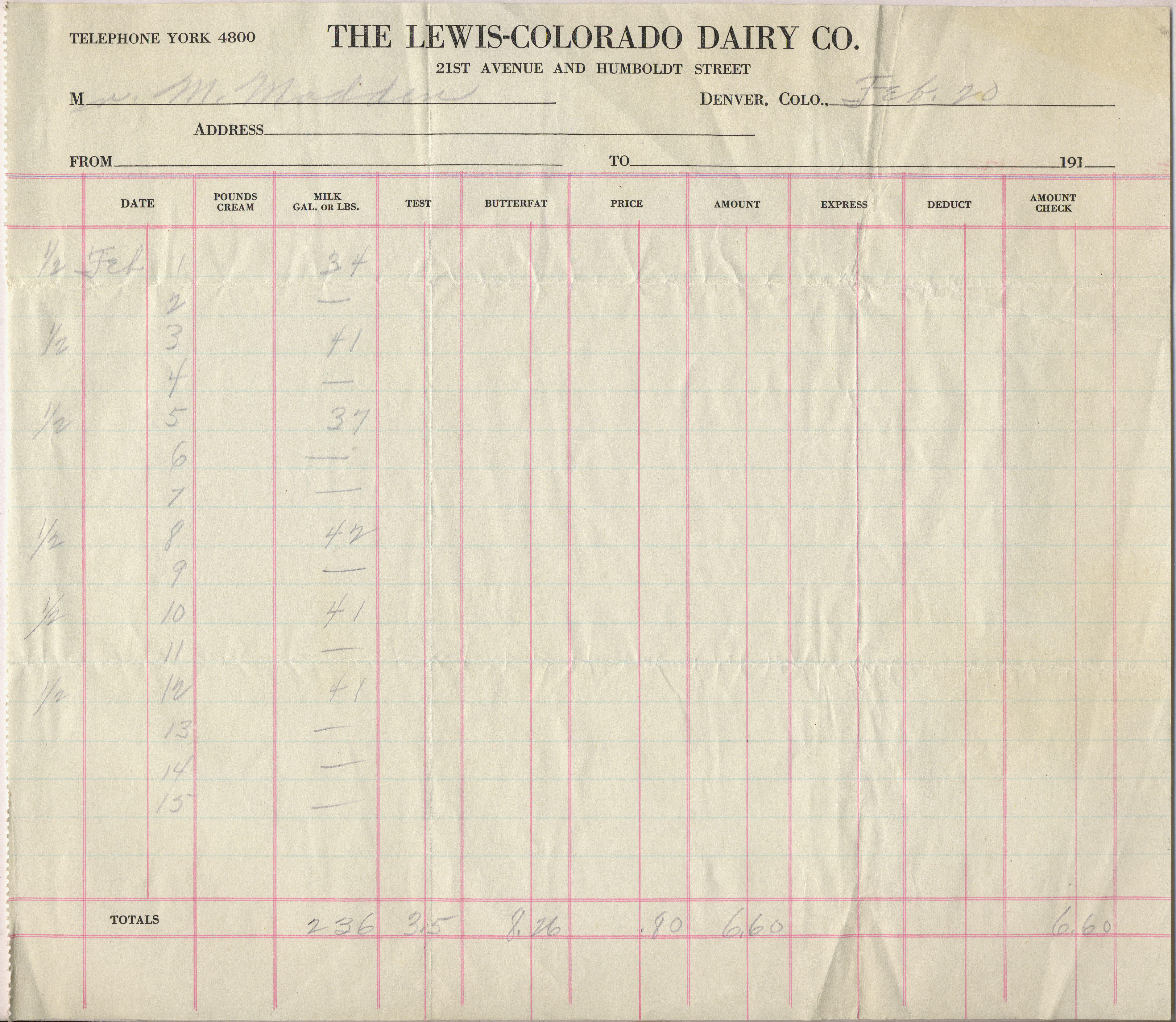 1908 and 1910s accounting lists for Denver companies for cream produced by his dairy cows through the years |