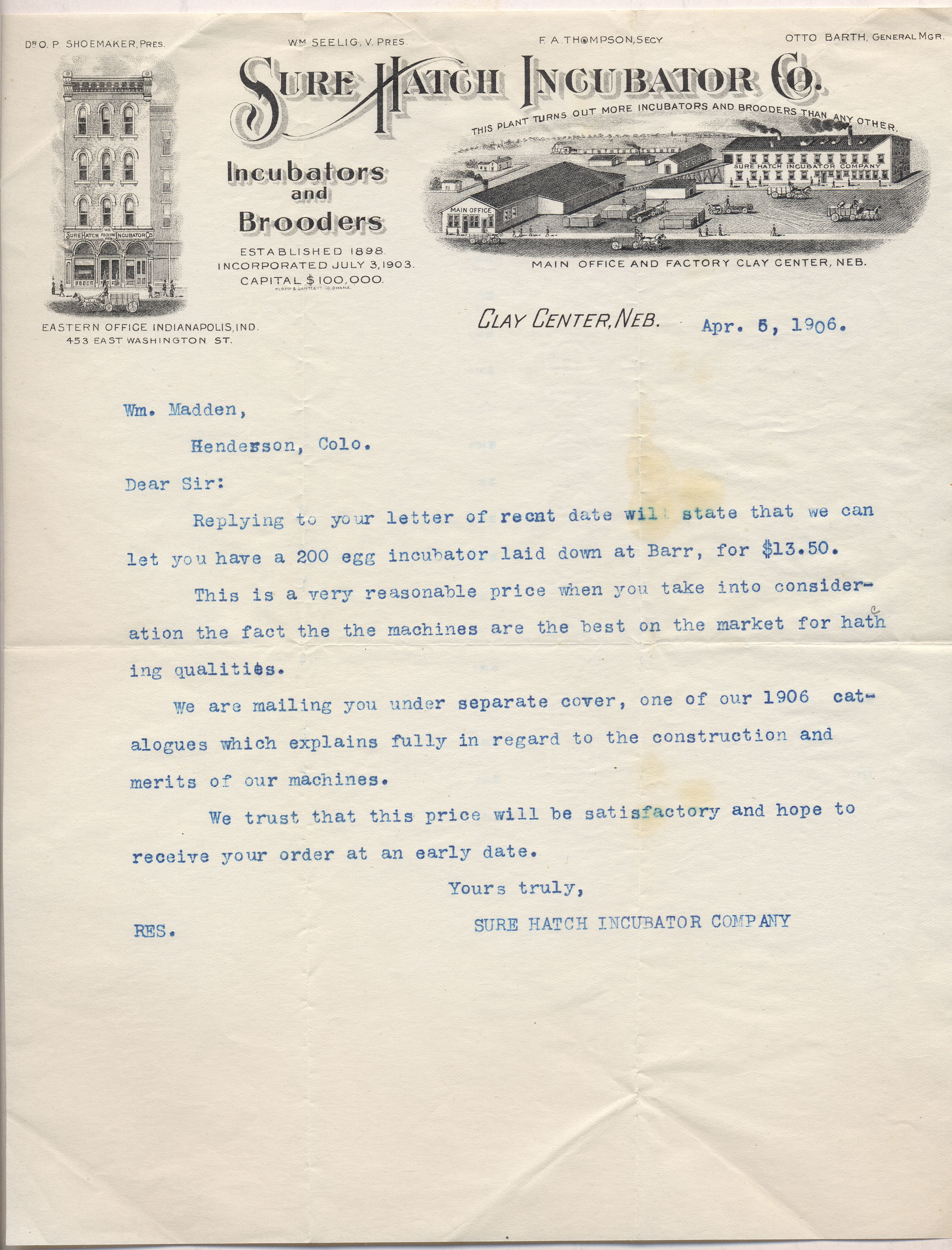 1906 Letter from Sure Hatch Incubator Company in Nebraska for raising chickens. |