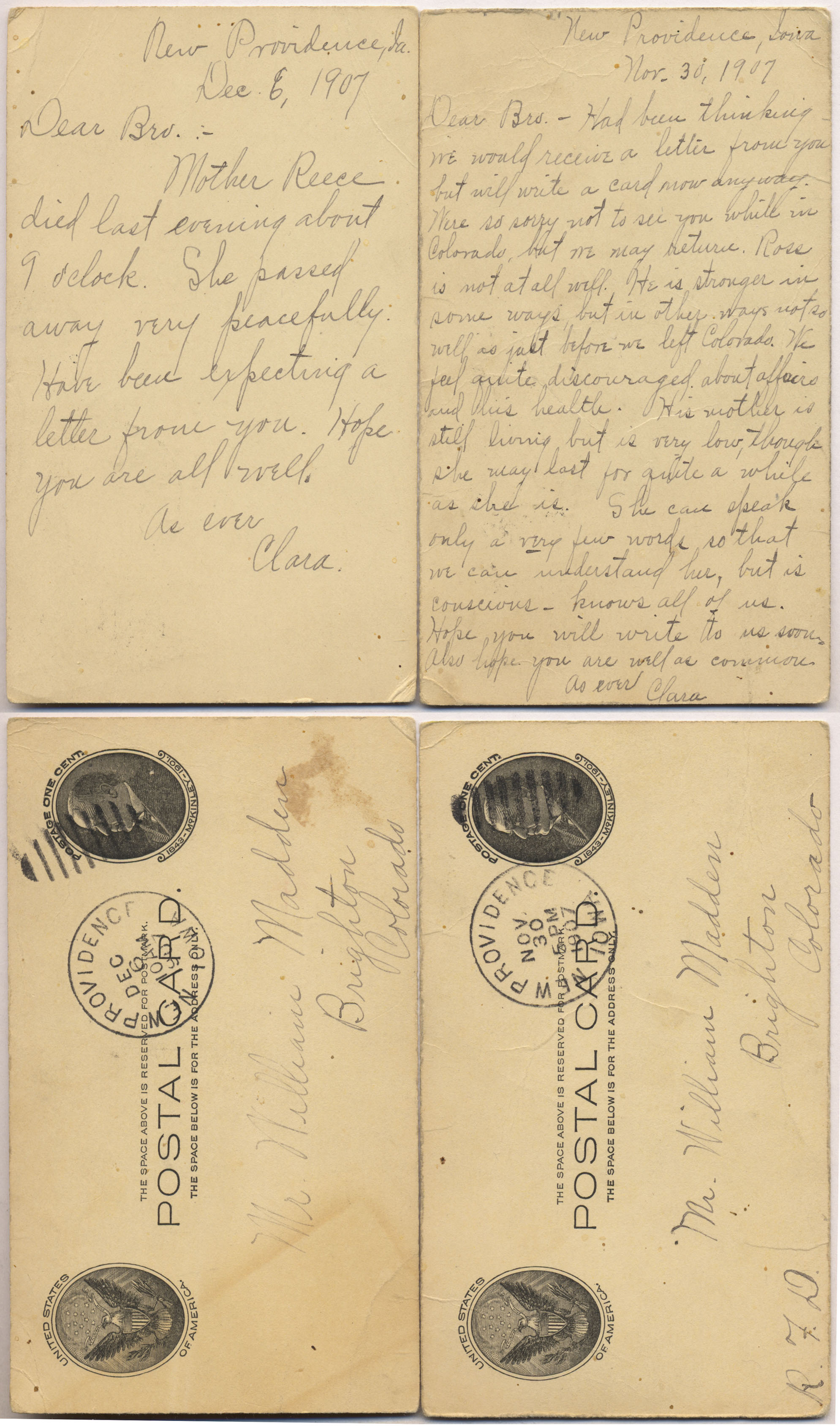 1907 Post Cards from his sister, Clara Madden Reece in New Providence, Iowa. One card mentions the death of her mother in law. |