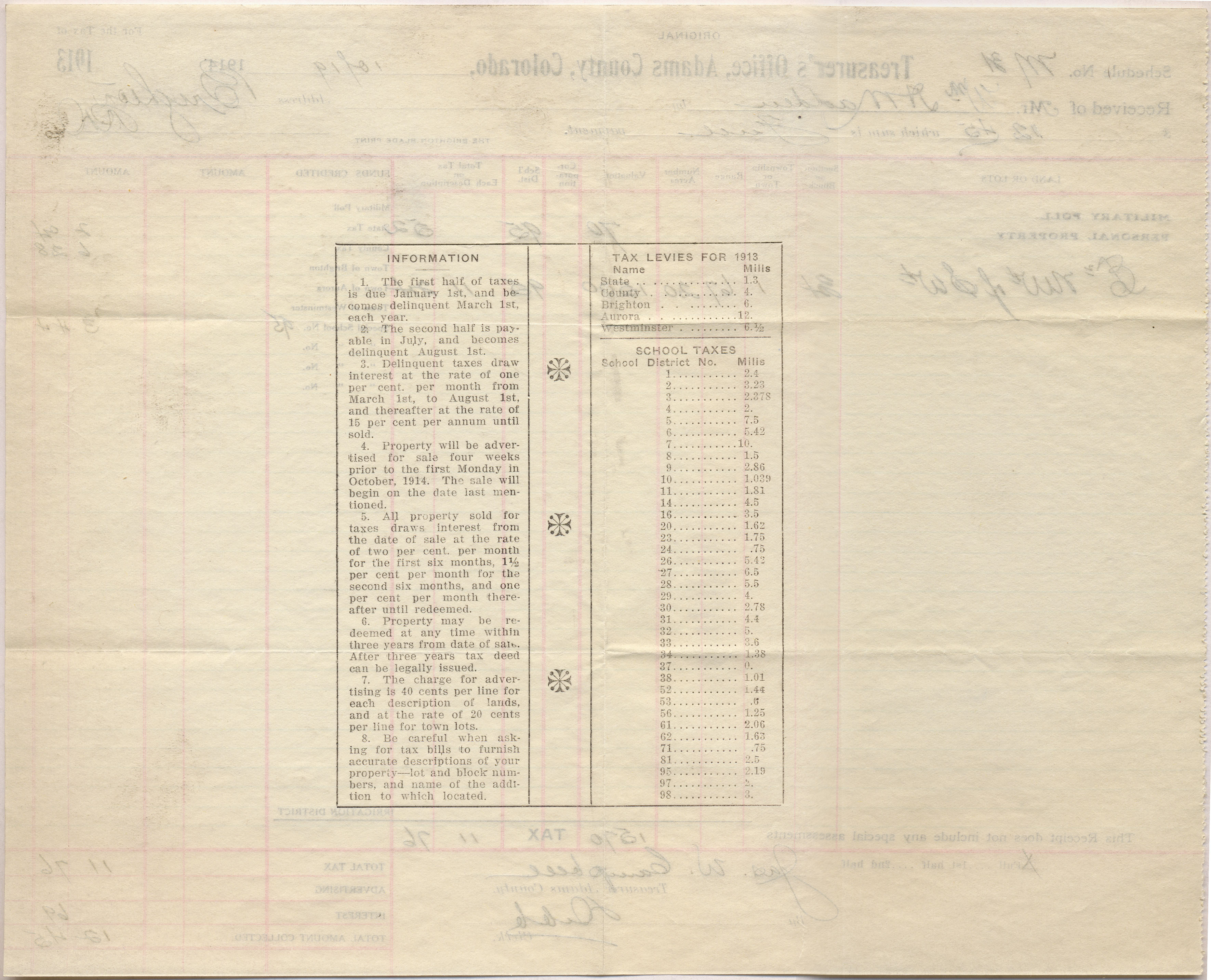 Charles and William made an investment together purchasing the Alcott, Berkley homes in Jefferson County. Later in 1905, Charles would write William about paying the taxes in Golden on lots 7 and 8 in Berkley. Who ever had a bit of money at the time would pay on the notes and cover expenses like insurance and repairs. Each brother would document the payments made by the other on scraps of paper.