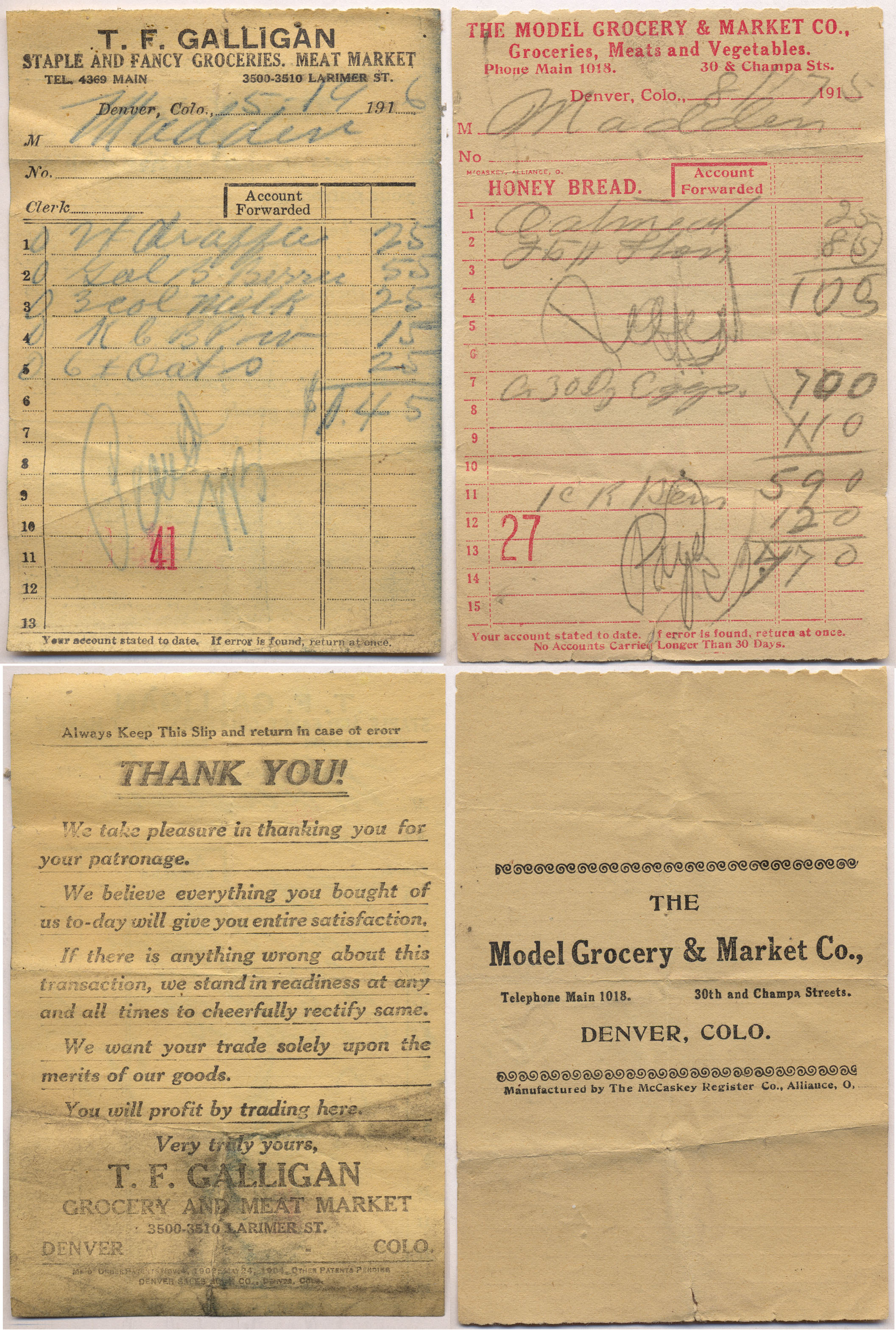 1915 and 1916 grocery receipts from Denver. There were dozens of receipts in the milk can. |