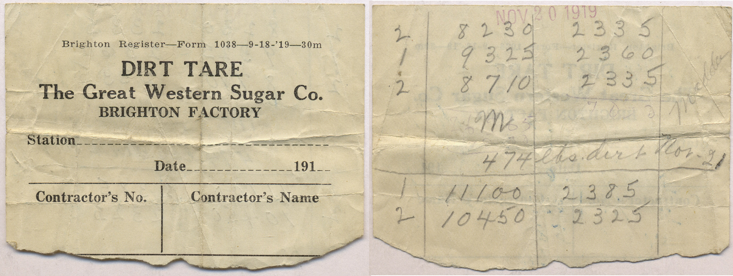 1918 Cream stub and 1919 "dirt tare" notes on a receipt scrap from the Great Western Sugar Co. for harvests of sugar beets.