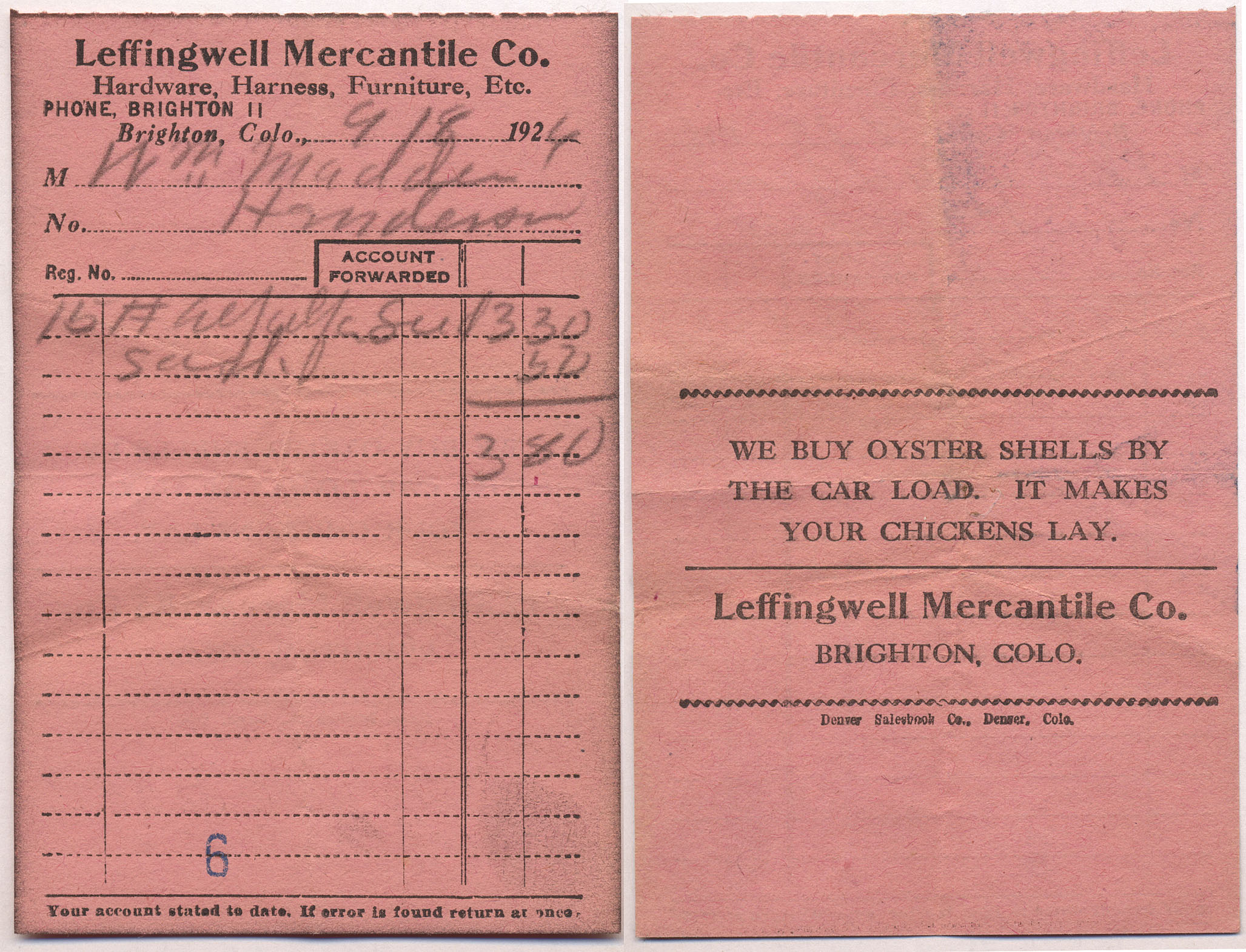 Streets and shops William would have frequented. Taken about 1908 by Louis Charles McClure, the photo looks north on Division Street, renamed North Main Street, from the northeast corner of Bridge and North Main Street in Brighton, Colorado. Horse-drawn wagons and carriages are parked near sidewalk lined with brick and wood shops and businesses including, A.S. (Archie Scott) Leffingwell Hardware (see recipt below), the Brighton Blade (multiple subscriptions), Brighton Mercantile and Bakery, and Elite Saloon. Additional signs include "Ice Cream", banner advertising "For sale, canvas for ditch dams, tents, wagoncovers, horse blankets, etc.," "Lincoln Paints," and directional sign pointing to "Harness shop." The photo also includes early vehicles, a large enclosed wagon with "Movies" on top part of enclosure drawn by four or more horses on dirt street, fire hydrant, and bar for tethering or hitching horses. Photo from the Denver Public Library Digital Collections. |