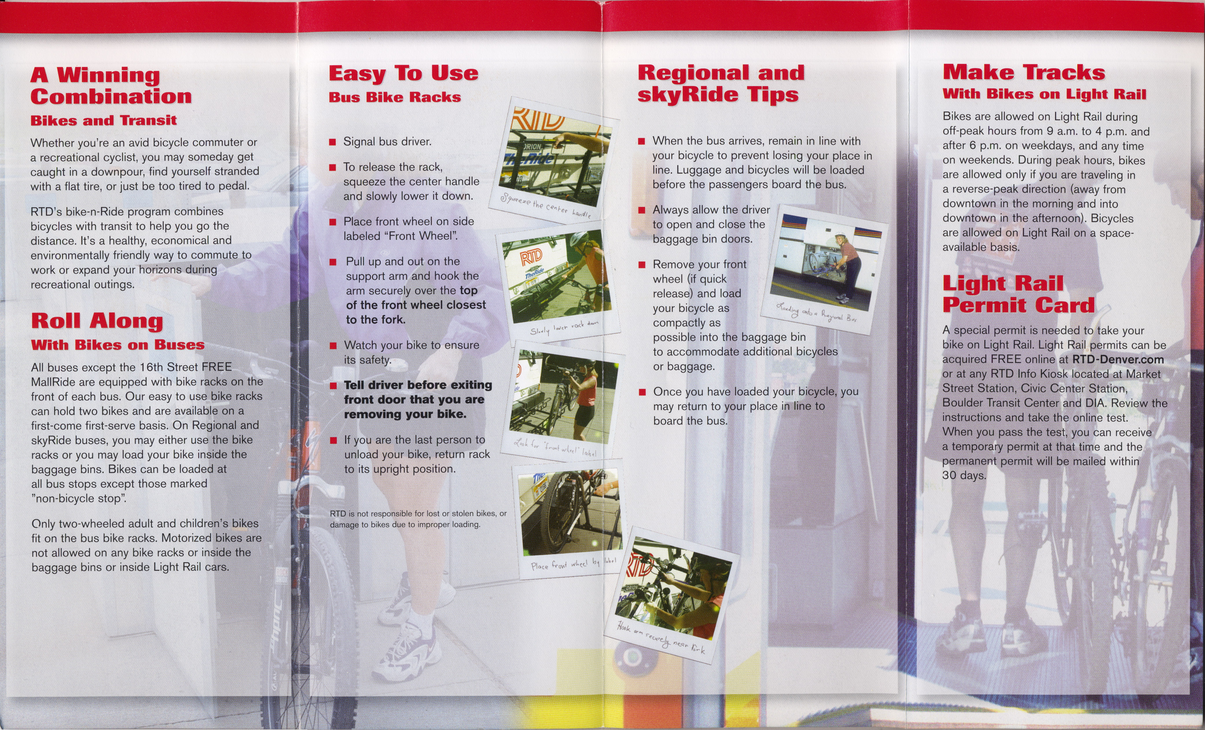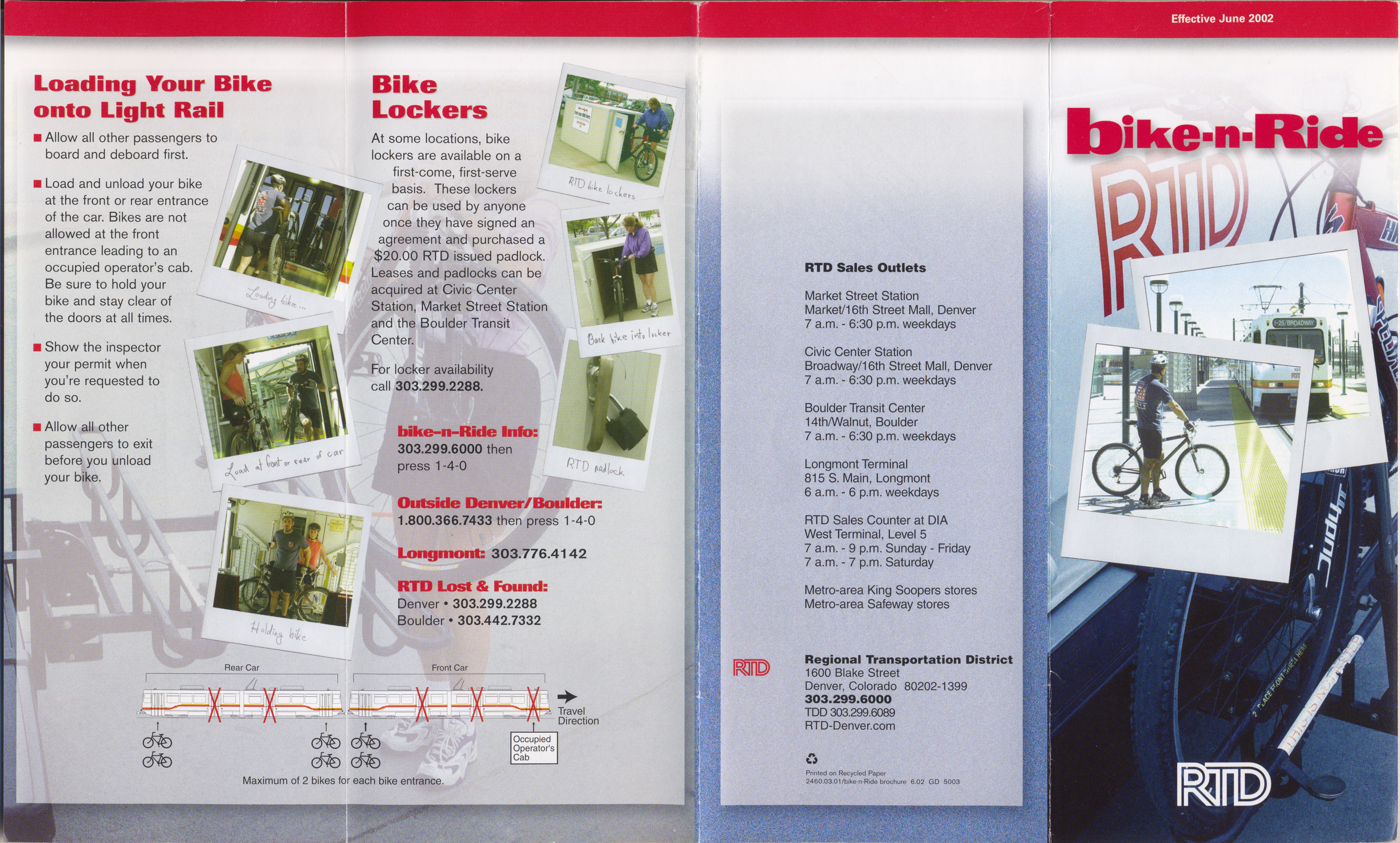 RTD put out a pamphlet in June of 2002 describing the introduction of Bike-n-Ride. The publications shows where bikes could be located on the train and bus.