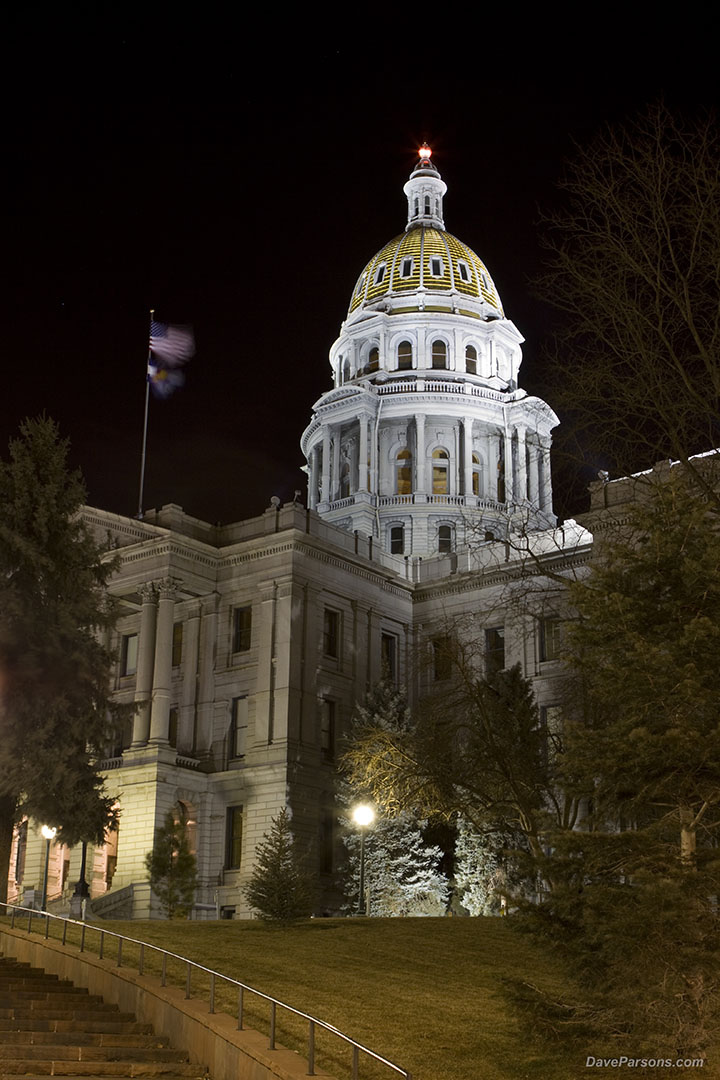 On new years eve, the U.S. flag flaps in a cold wind and the gold dome of the capitol glows warmly during a nighttime excursion into Denver's streets. Parsons photo