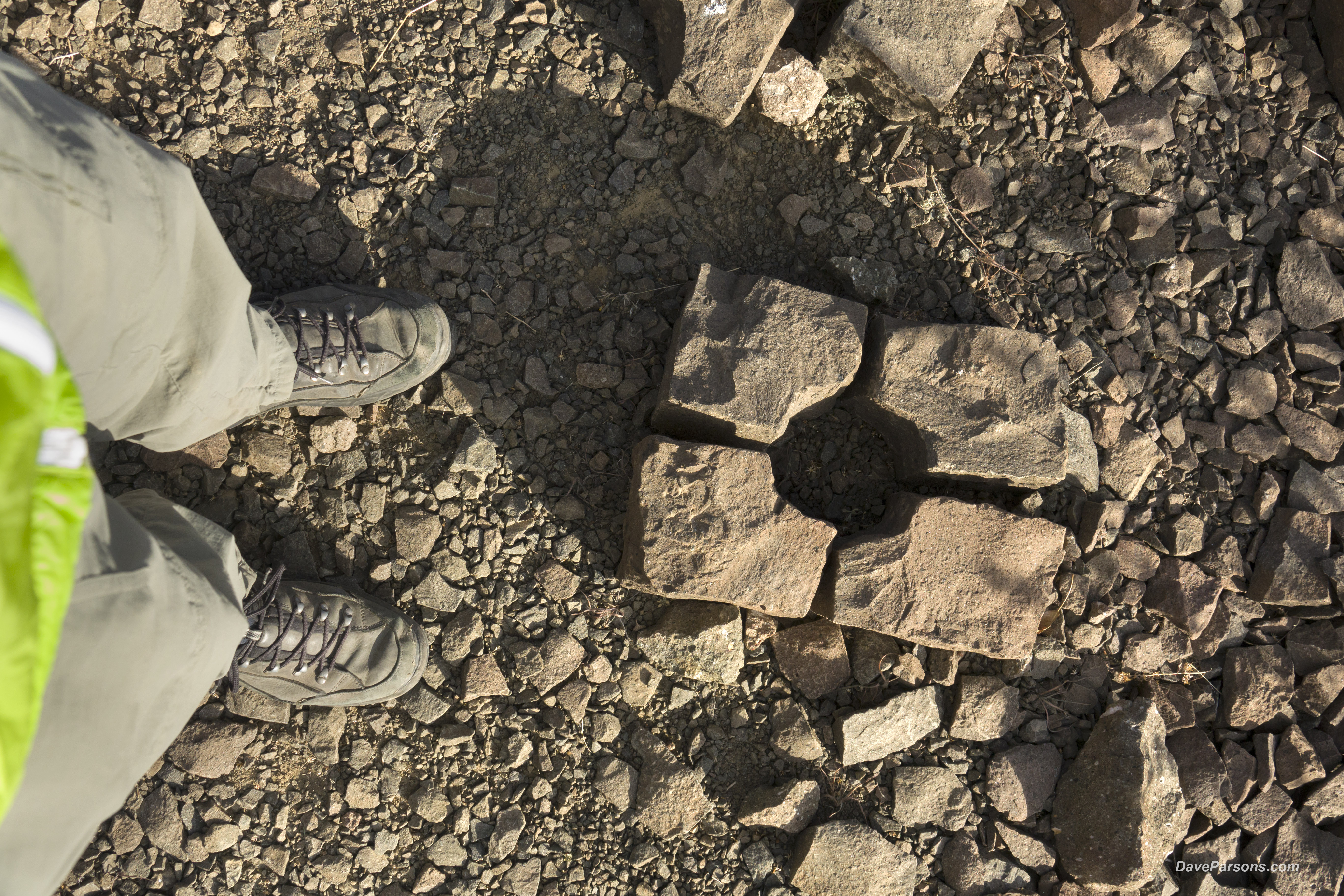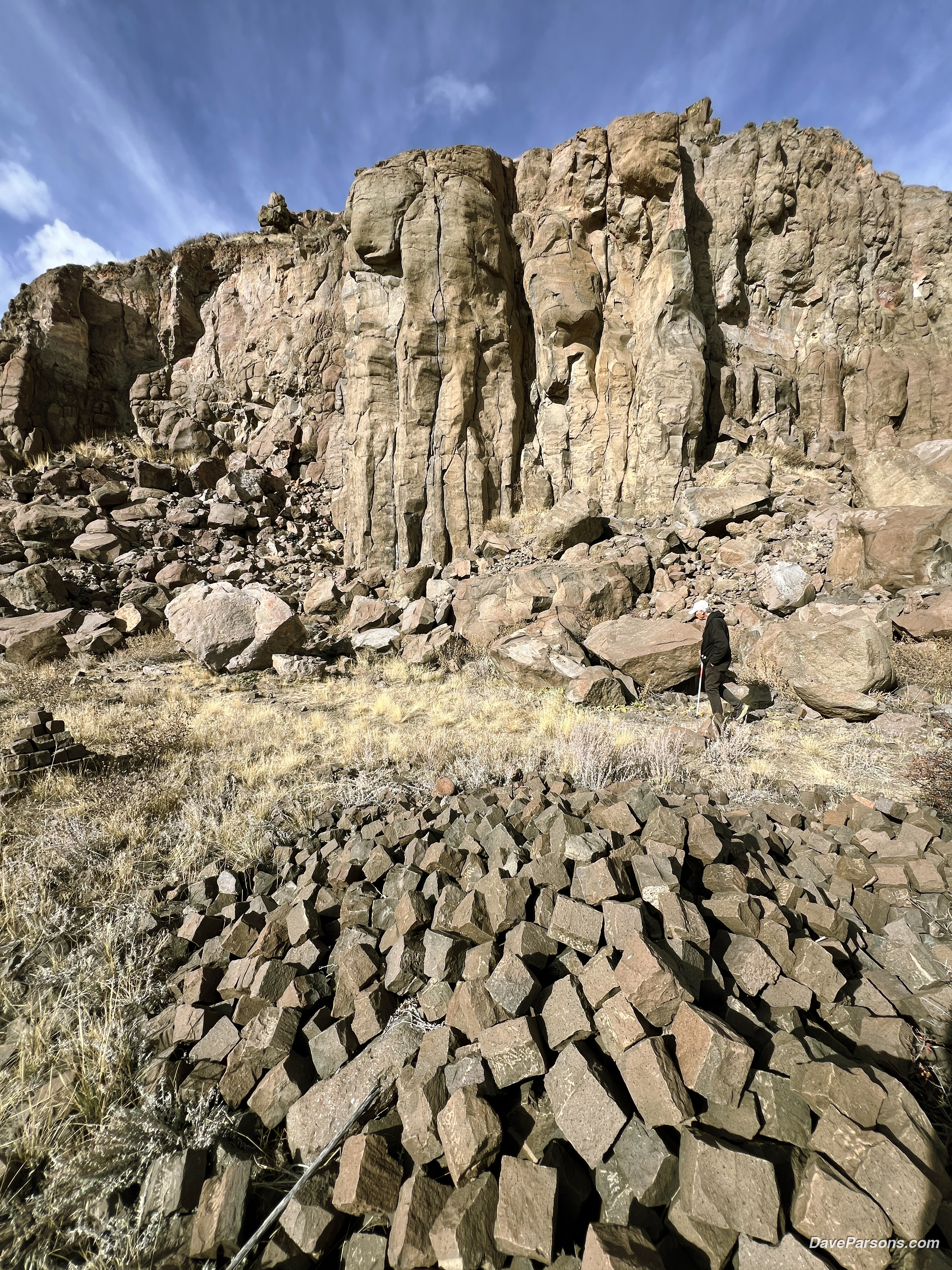a hiker walks among the piles of brown basalt which are left at the base of the cliffs that rock climbers frequent today in 2025. Parsons photo.