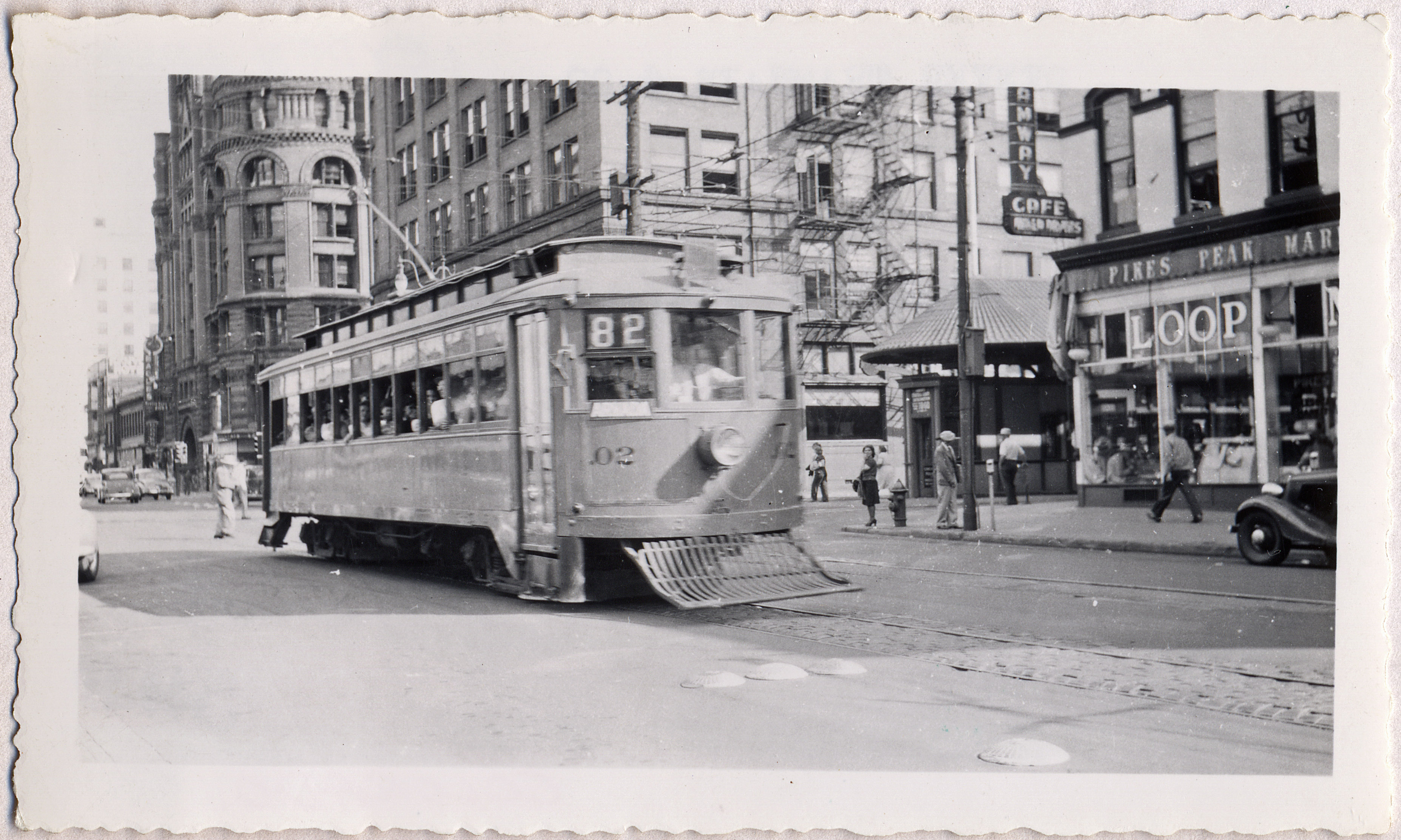 More basalt cobblestone pavers line the tracks on 15th street like the ones recently uncovered on Tremont. I wonder if they are still there? The photo looks southeast from 15th and Arapahoe with the Mining Exchange Building in the background and Loop Market station in front of the Pikes Peak Market. Parsons Collection.