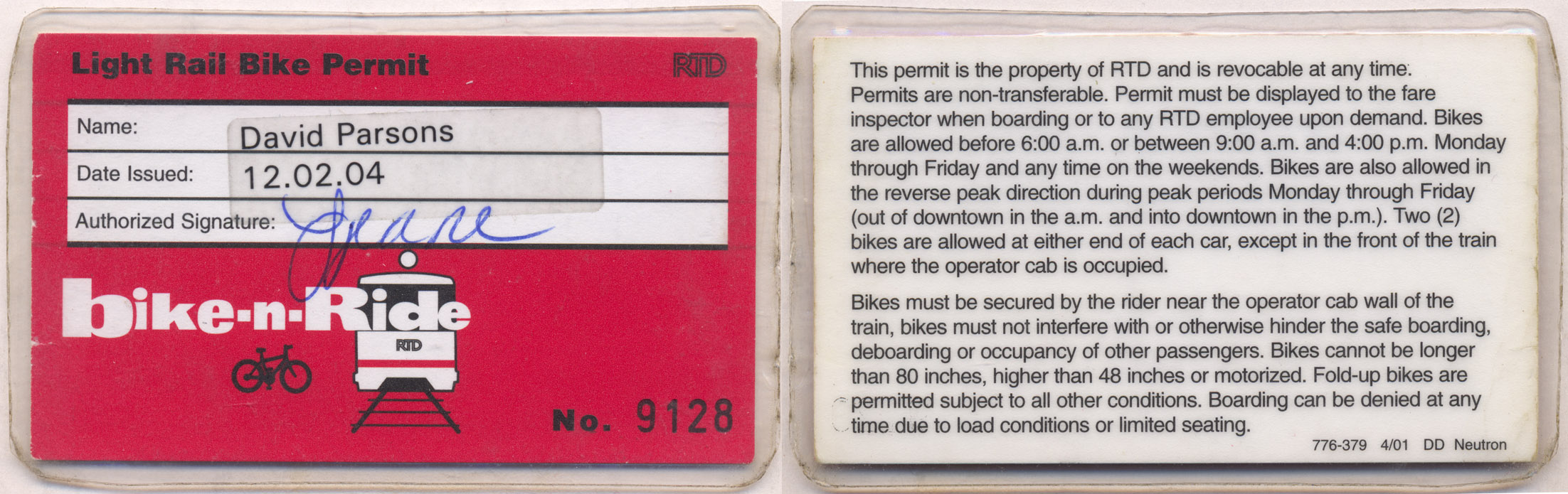 In 2004, a permit was required to ride the Light Rail with a bike when the program was initially introduced. Parsons collection