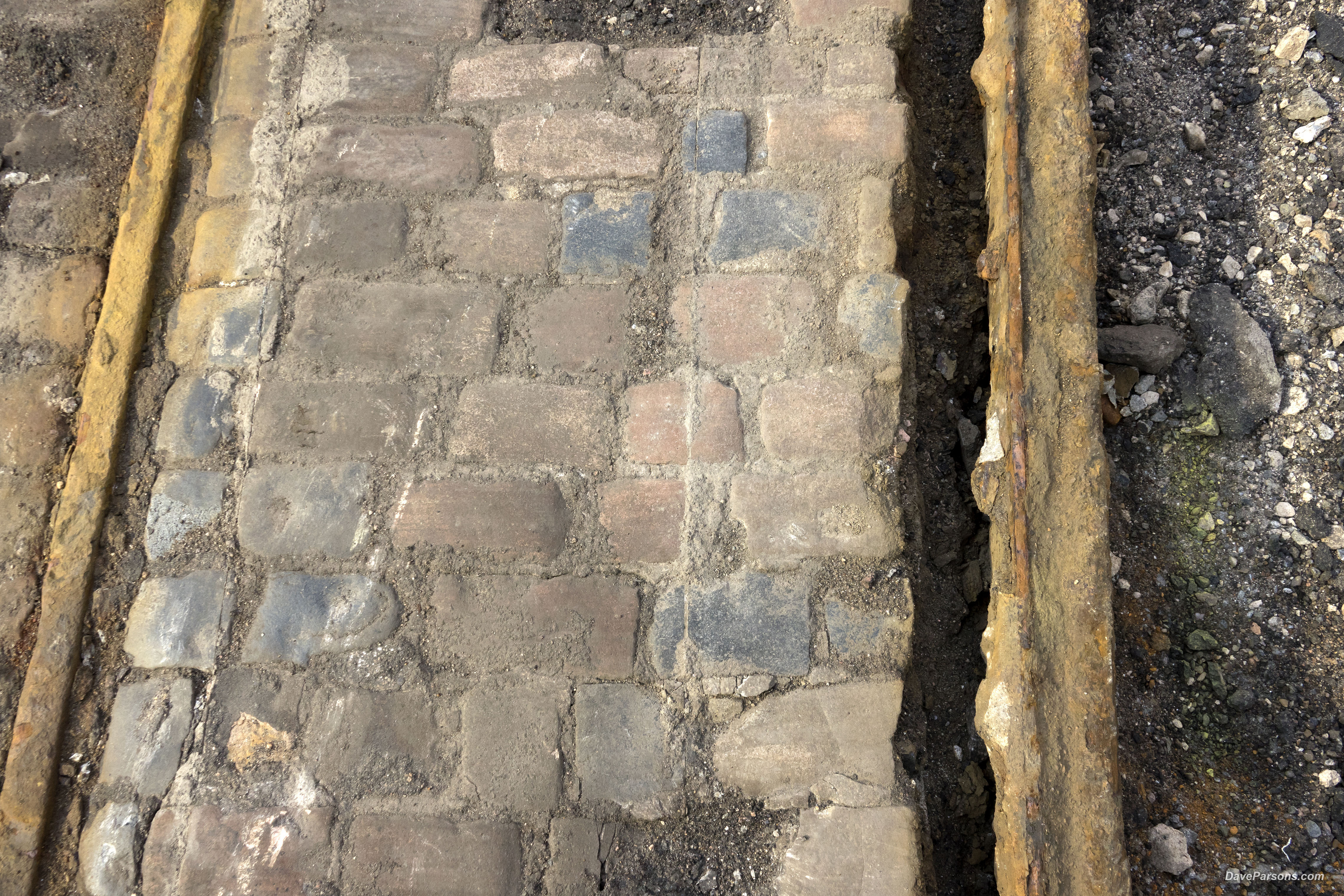 Picking up one of the stone pavers gouged out of its once happily nestled home, I hefted its solid weight and tried to look at the mineral composition through the encrusted grit and dirt. It would require more research, however, its weight made me me think it was granite. Rubbing a spot of dirt, the top surface was shiny, polished smooth by over a hundred years of horse shoes, poop, pedestrians, snow shovels, brooms, wagons, weather and trollies that had passed over. Likely to be tossed into a landfill as trash, I dusted it off and slid it into my camera bag leaving the remaining stone pavers to their fate. I feared that this little window into the past that most people would consider junk or find uninteresting would be torn up and discarded (Hopefully, some of the rails and pavers were rescued because today, its now paved over again).