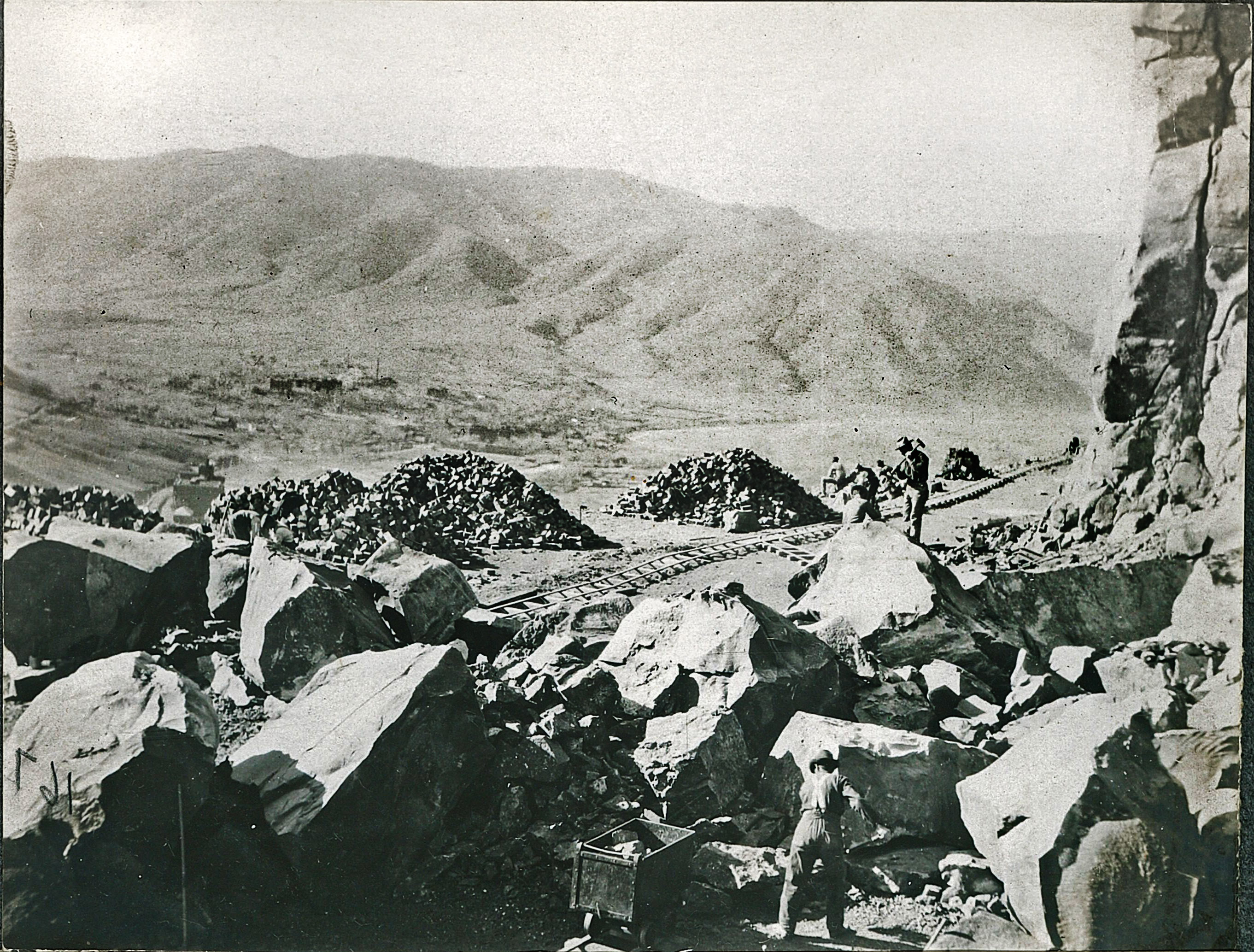 Looking west towards Lookout Mountain with the Colorado School of Mines and Clear Creek in the valley, workers break up rock in the basalt quarry about February, 1906. Large boulders, blown up with dynamite from the cliff side were broken up and shaped into rectangular pavers. Finished blocks were loaded on ore carts, rolled to the top of the tramway where another cart was filled and carefully rolled down the mountain. Notice the small rail spur lines to each boulder area.