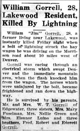 Tragedy struck again in 1935 when Jim Gorrell, working in the fields near South Garrison Street, was killed by a bolt of lightning. It was his brother Bob's sad task to take a wagon to the scene and return the body to the family home. Nellie and Nora recall that Jim's shoes were blown off his feet and buckles of his overalls were deeply scorched into his skin.