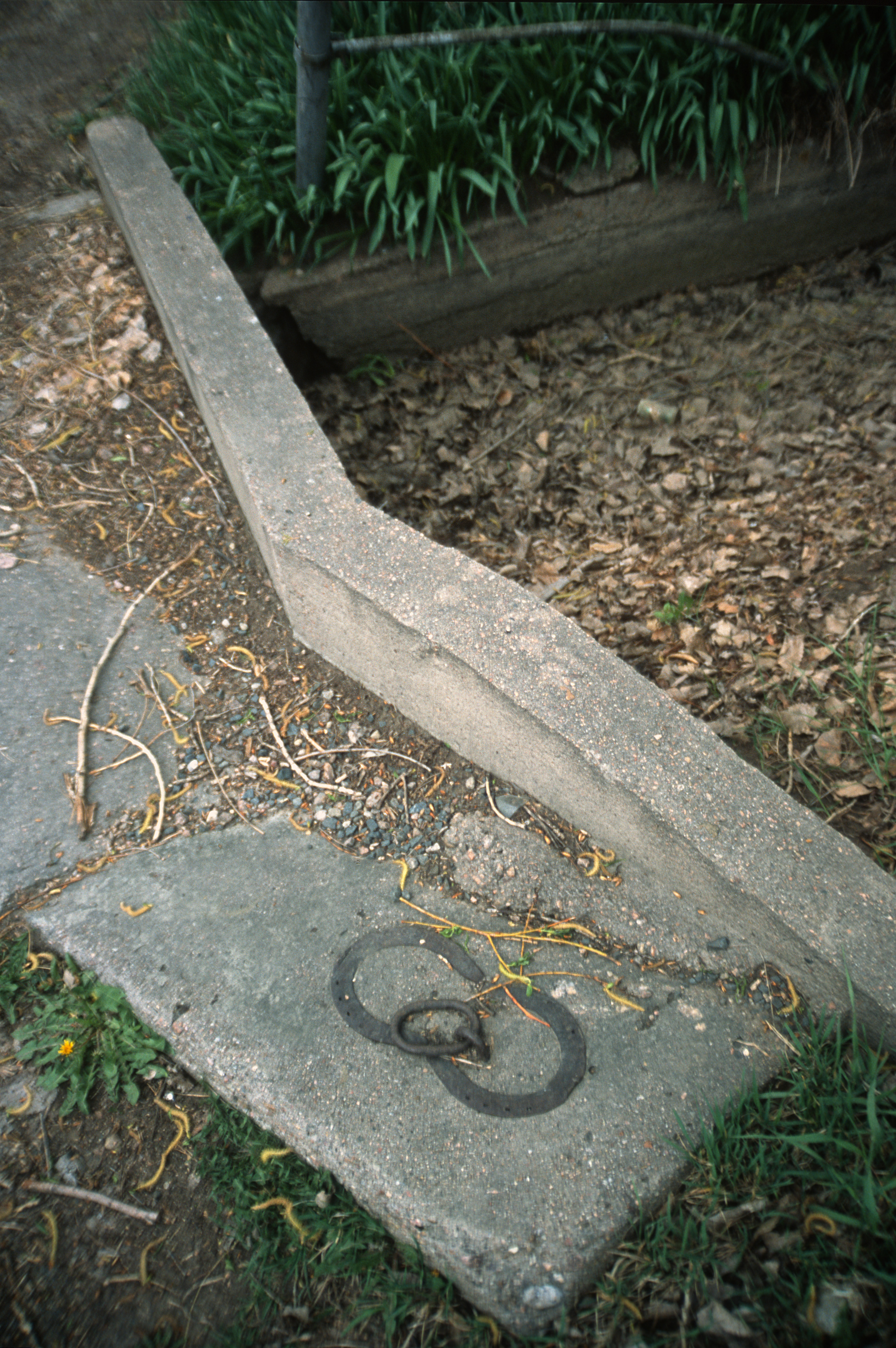 In between the home and bunk house and sunk into a cement block, a pair of horseshoes surround a loose chain link, perhaps at one time, convenient for parking the horse or for looping a horse lead for grooming or cleaning the hooves. |