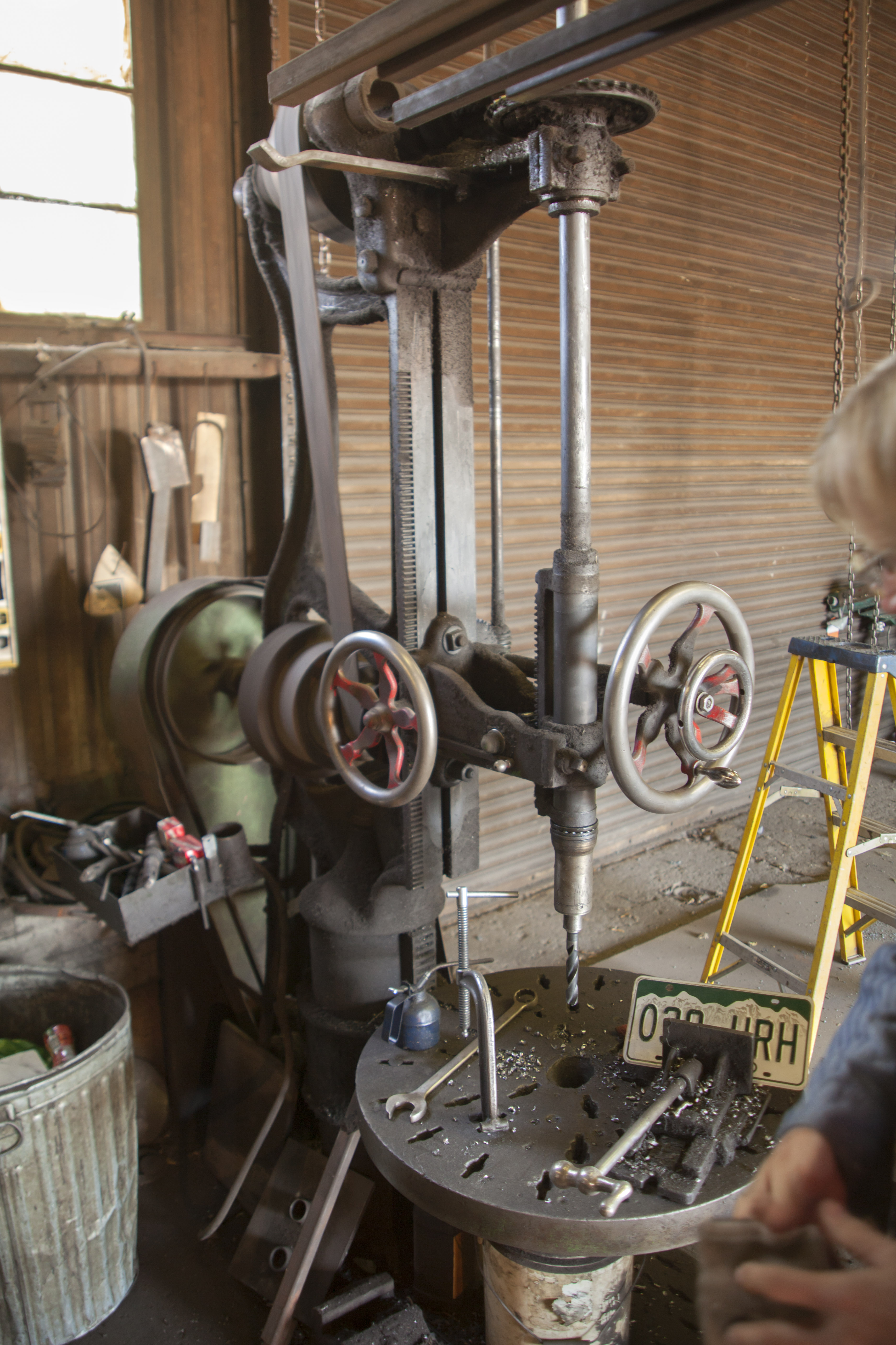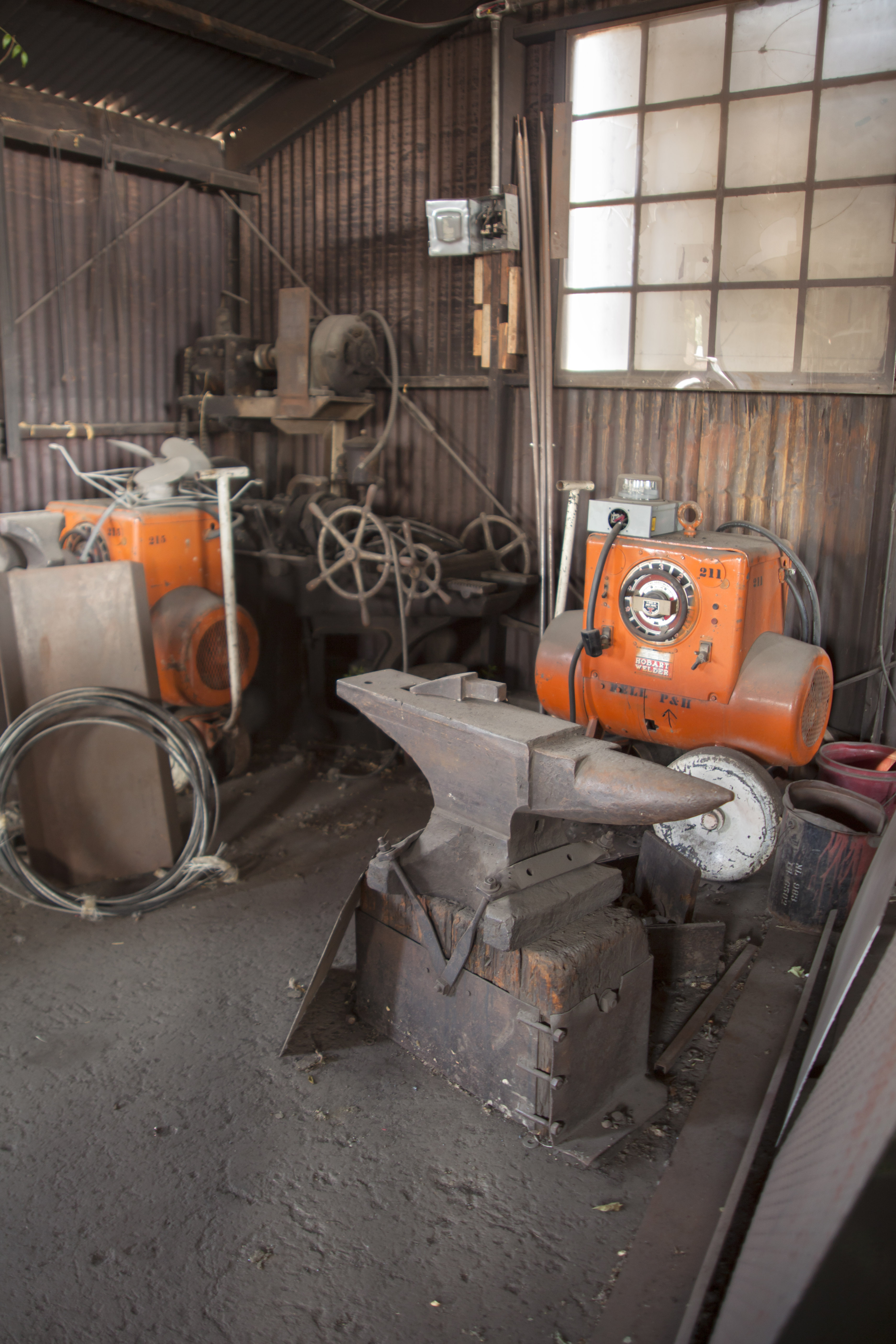 Also harkening back to the days of horse driven wagons and carriages, an industrial sized anvil remains mounted on a wooden blocks and bolted to the floor in front of welding machines and an old metals lathe manufactured by David W. Pond of Worcester, Massachusetts. |