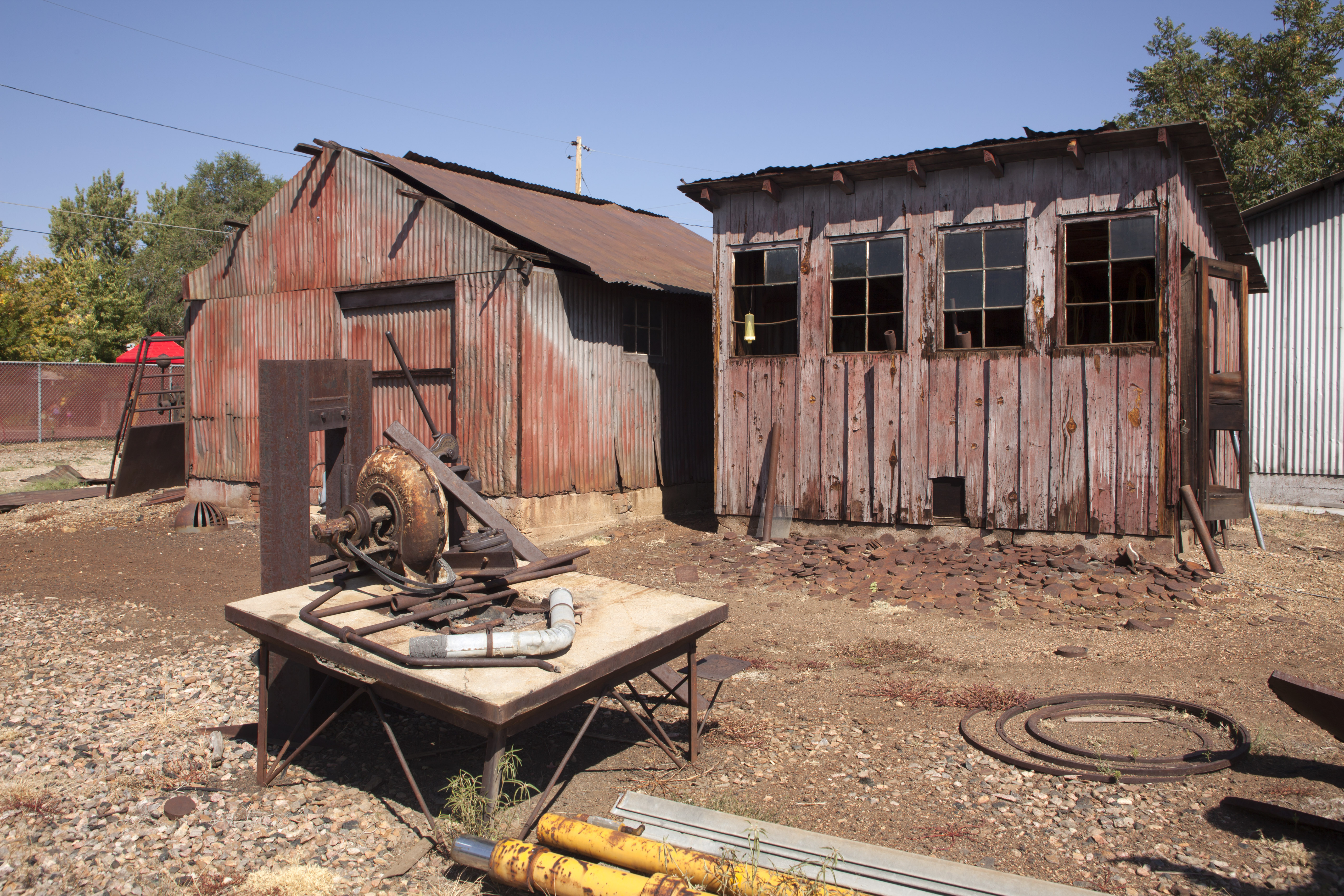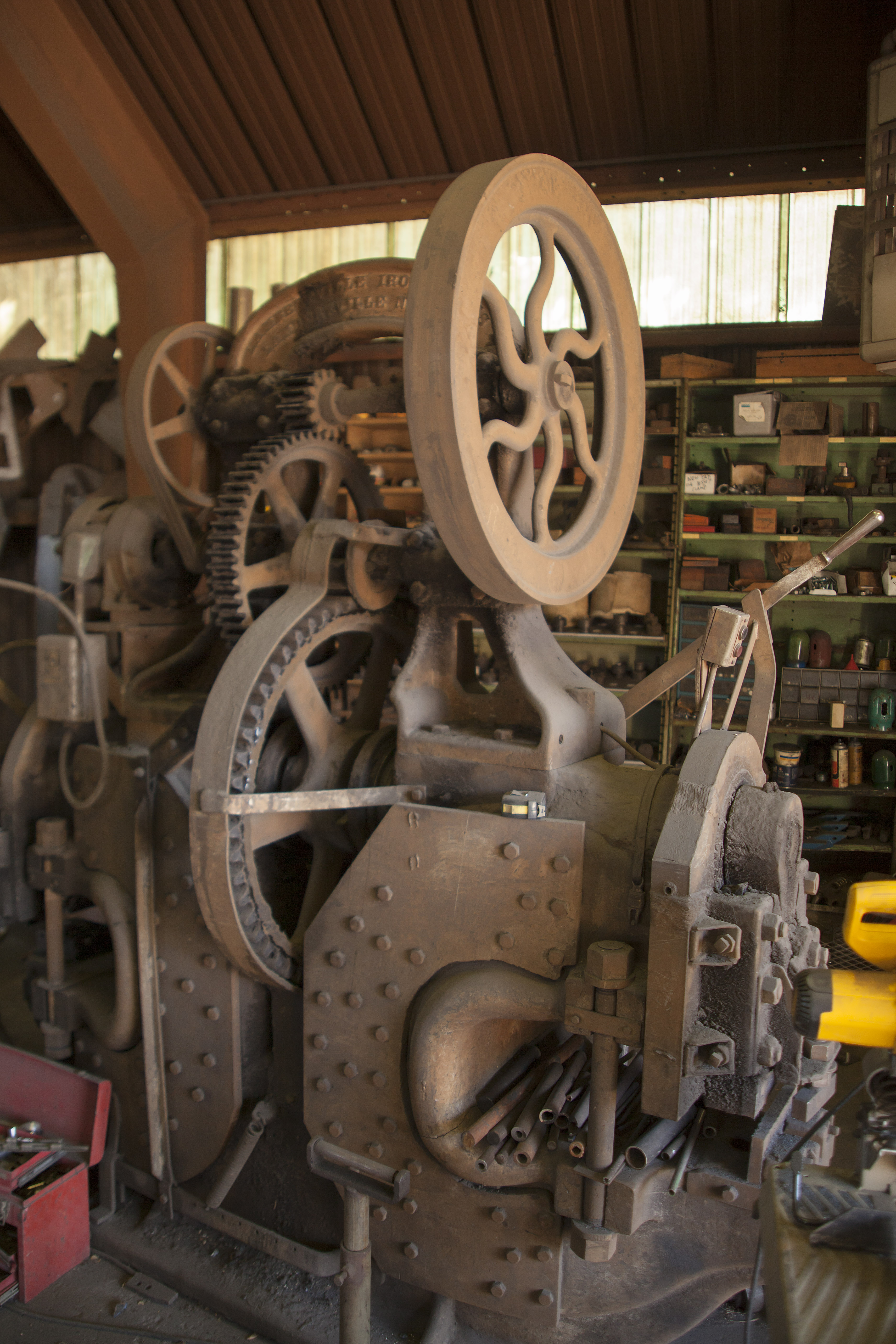 The 250 ton press can be seen in the Welding building and in front, an antique metal plate rolling and bending machine curls strips of sheet metal into giant round shapes. The belt driven machine has large gears protected by a wire mesh. The old machine originally came from the mining town of Blackhawk in the Colorado Front Range Rocky Mountains and was used to roll steel into round tanks. It can roll three-eighths inch steel plate eight feet long.