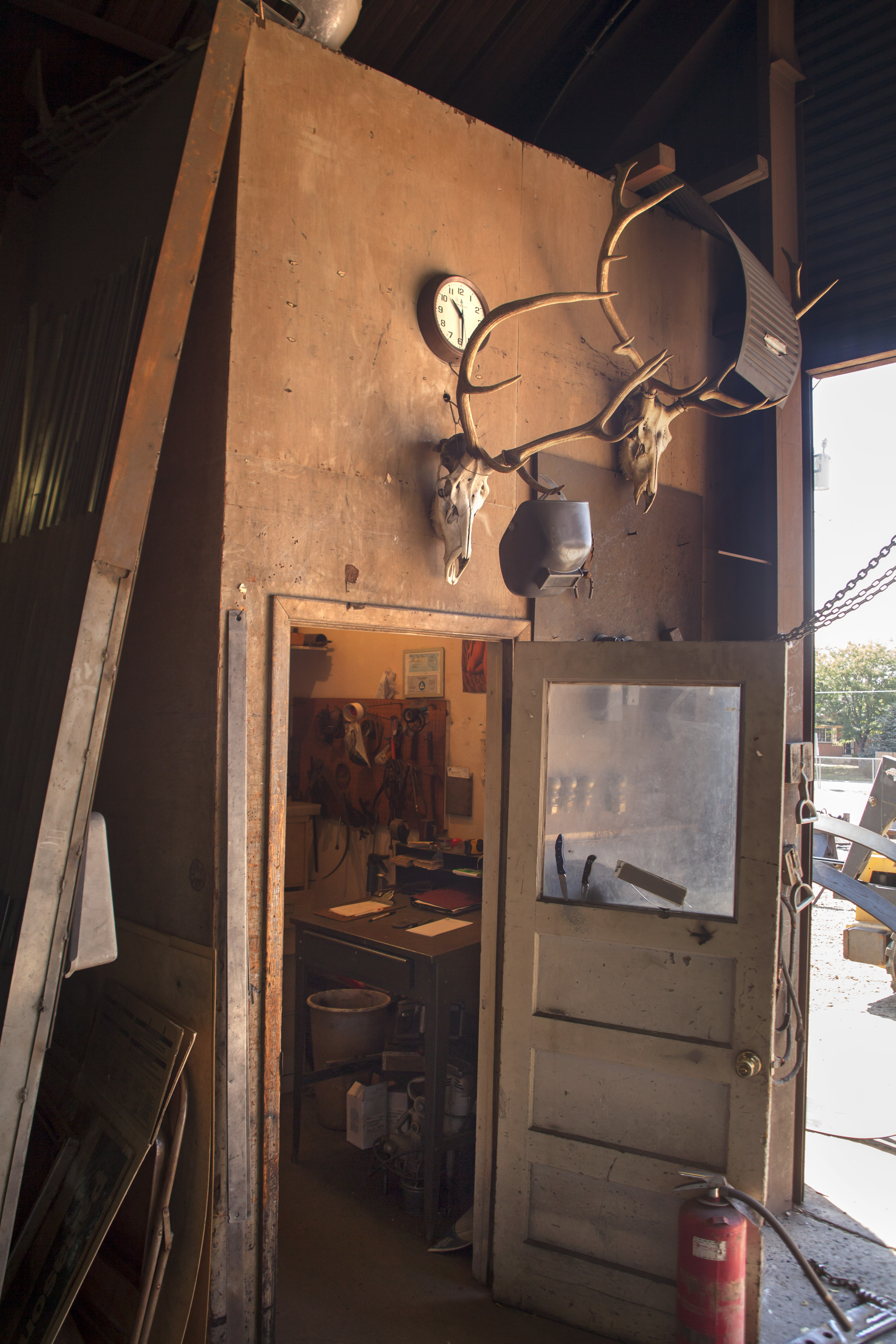 A welding mask/helmet dangles from an the elk antler perched over the office door proped open with a fire extinguisher. With pocket knifes wedged in the door frame window, the antlered skulls look out over the site office adjacent to the Welding building. An organized desk with paperwork sits under a pegboard of tools.
