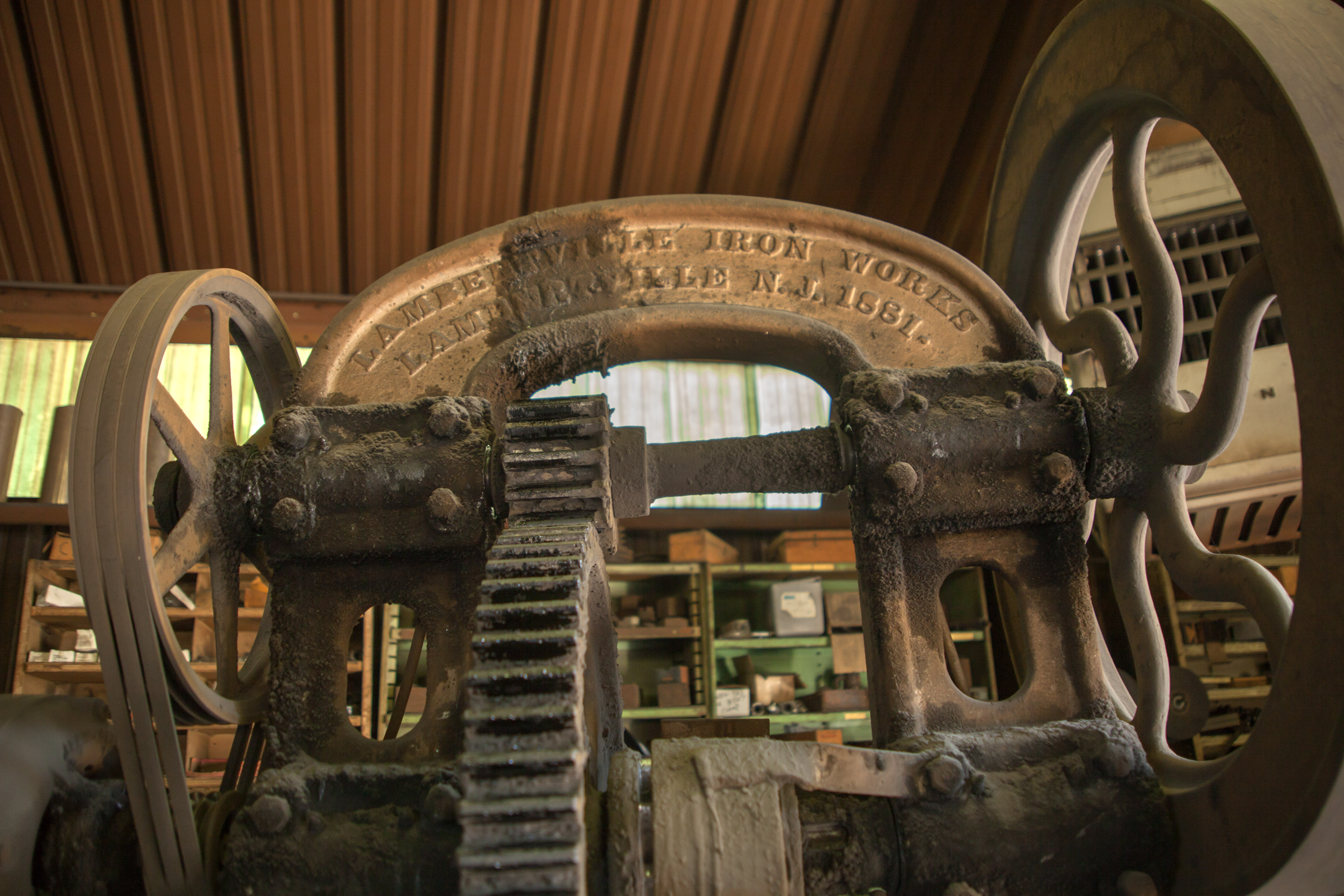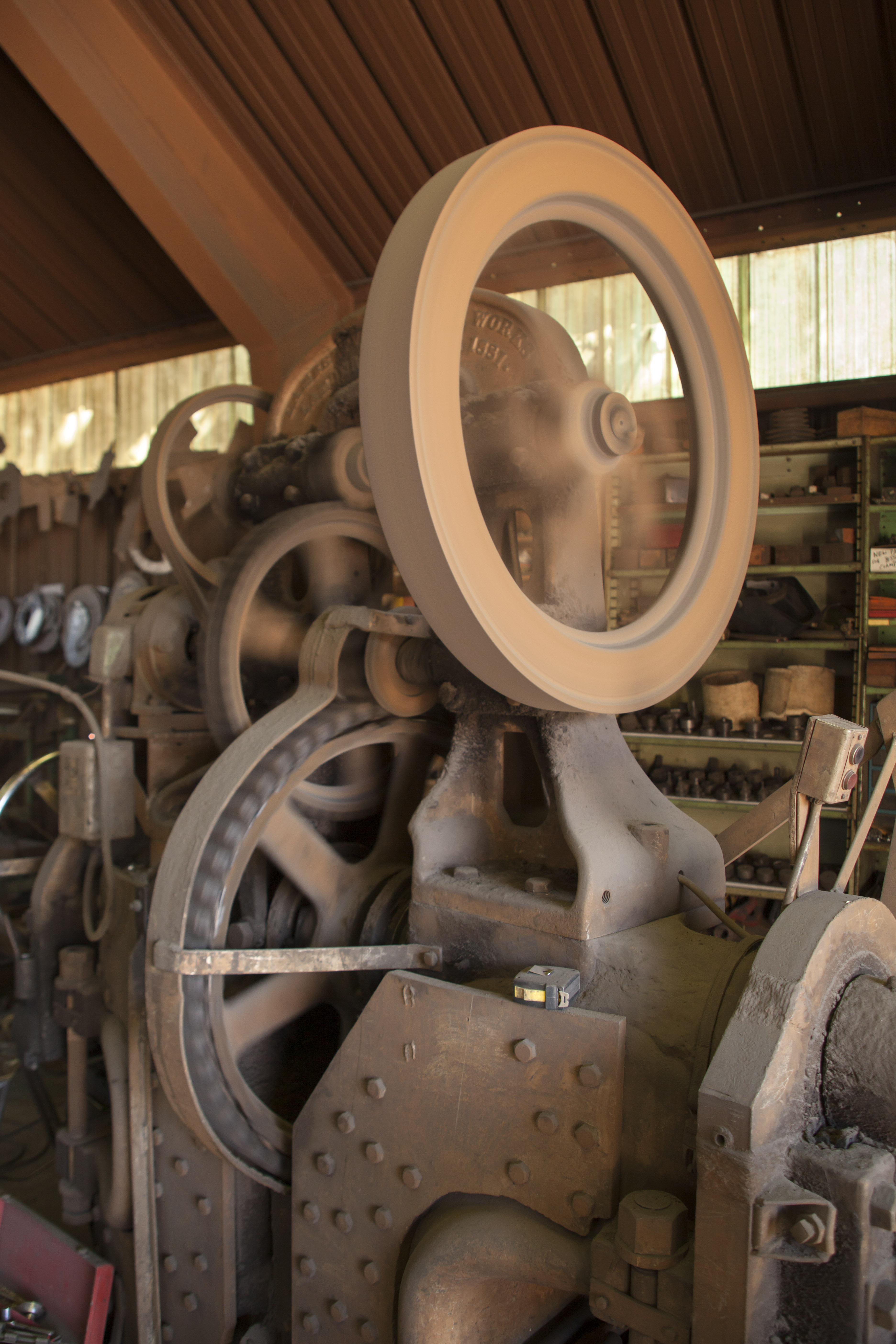 Still spinning since 1881, the antique shearing / punching machine evokes en earlier steam powered age. An electric motor now turns the gears, leaving the main belt driven wheel, once powered by a steam engine to spin freely. |