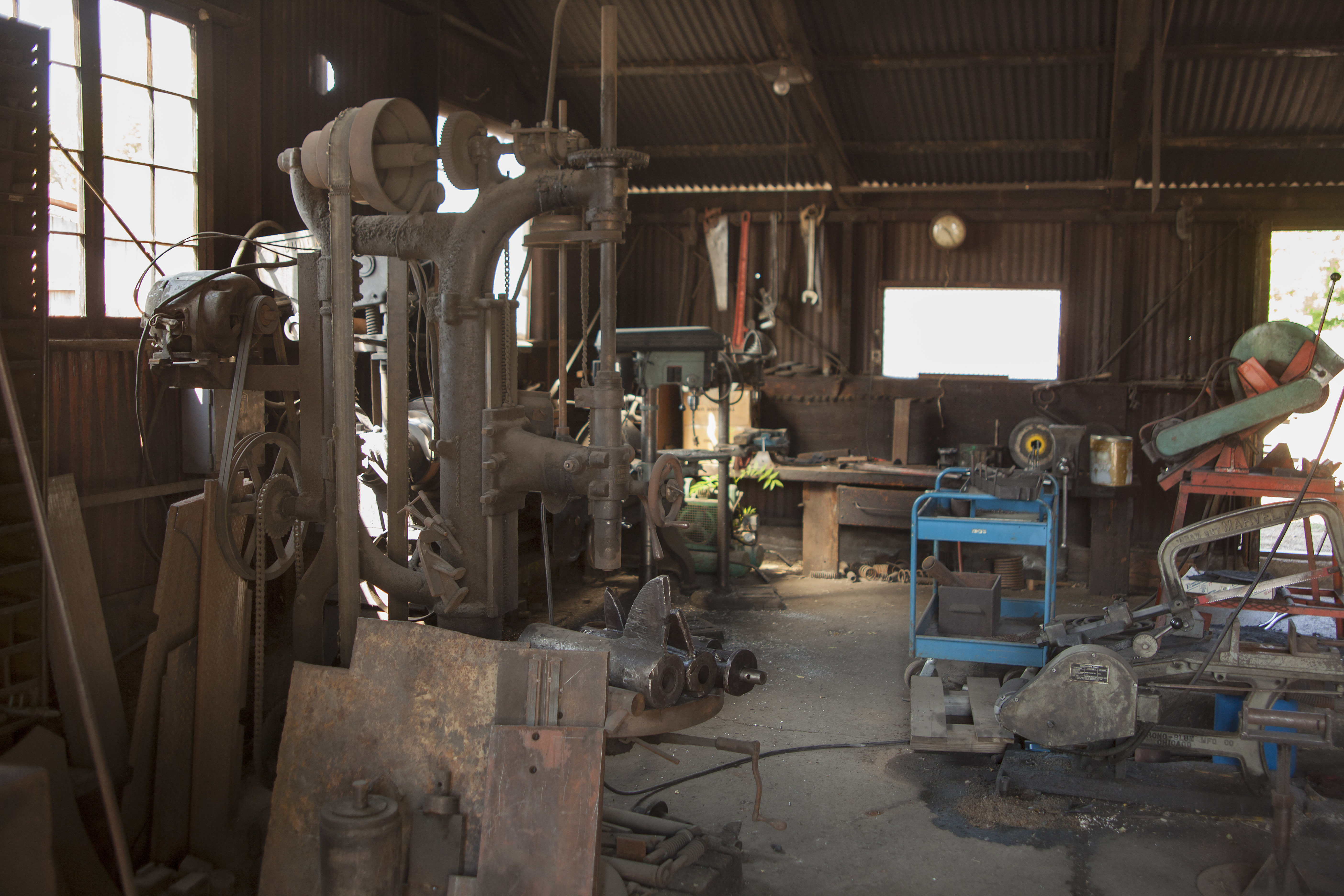 Standing in the corner, a welding stand sits ready for use next to wooden shelves housing small tools and metalworking materials with the 1881 built shearing/punching machine in front with support stands and a contemporary metal cutting saw. |