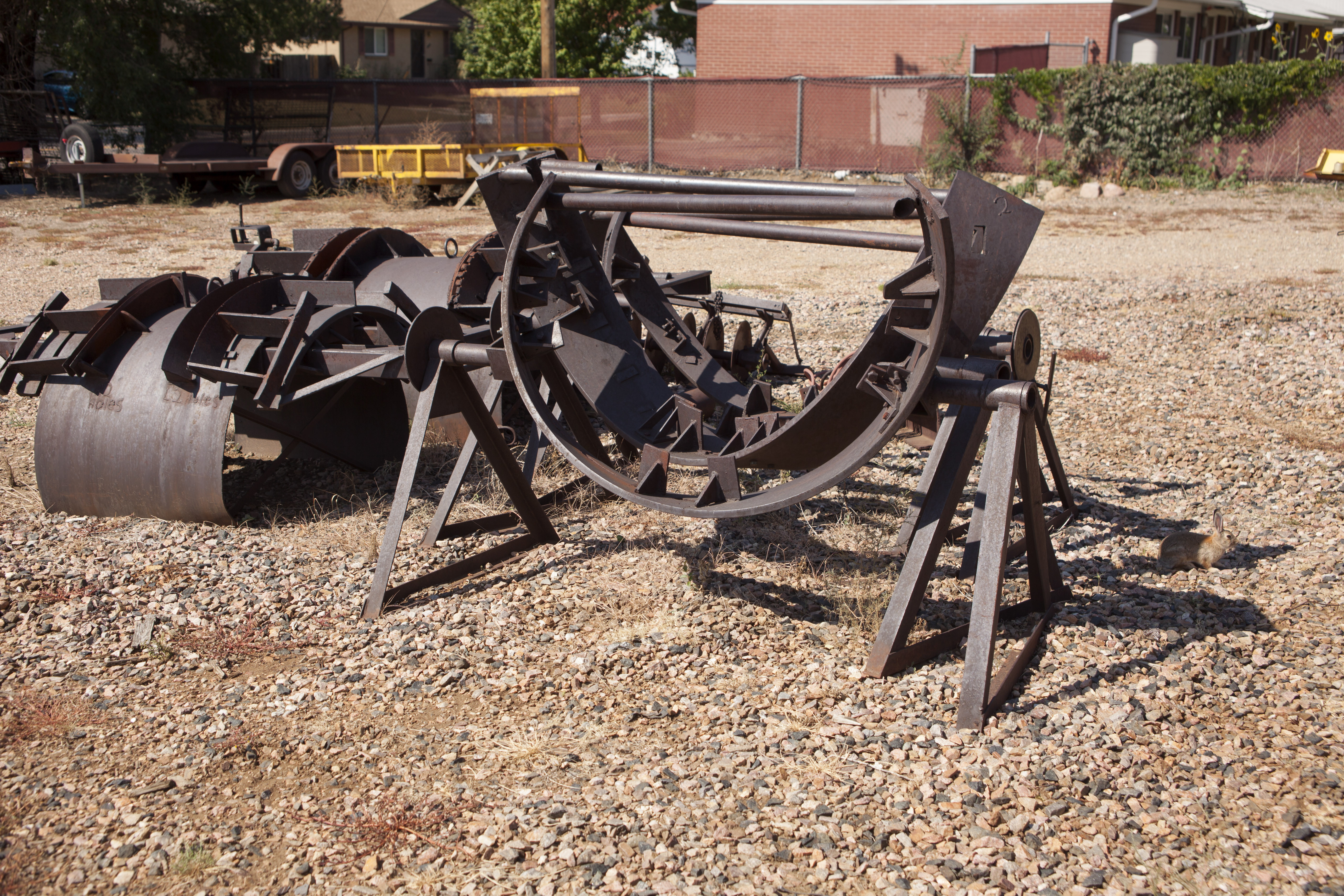 In front of the office and Welding building, an antique metal plate rolling and bending machine curls strips of sheet metal into giant round shapes. The belt driven machine has large gears protected by a wire mesh. The old machine originally came from the mining town of Blackhawk in the Colorado Front Range Rocky Mountains and was used to roll steel into round tanks. It can roll three-eighths inch steel plate eight feet long. |