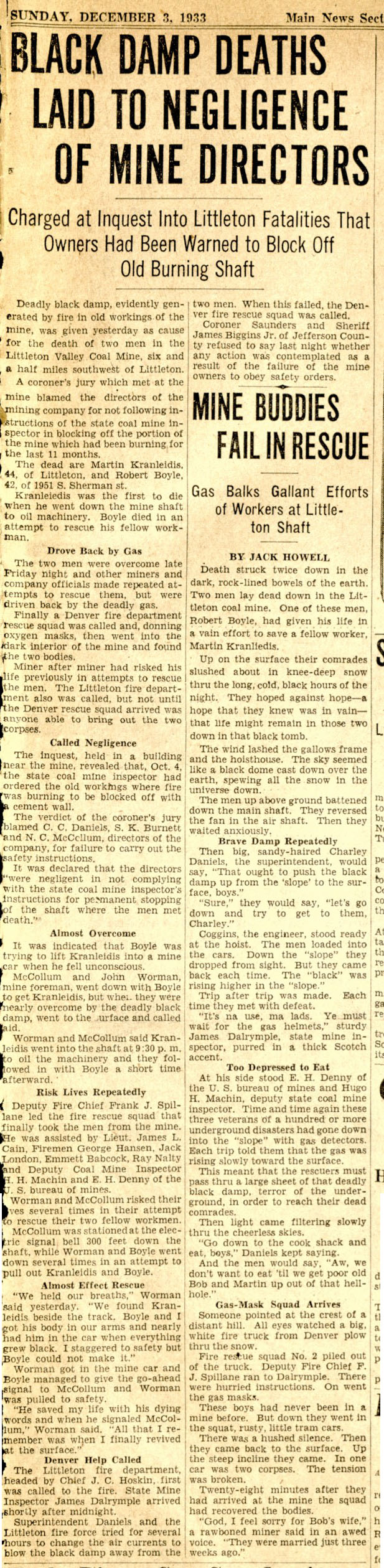 "When he went down the mine shaft to oil machinery. Boyle died in an attempt to rescue his fellow workman, drove back by gas. The two men were overcome late Friday night and other miners and company officials made repeated attempts to rescue them, but were driven back by the deadly gas. Finally a Denver fire department rescue squad was called and, donning oxygen masks, then went into the dark interior of the mine and found the two bodies. Miner after miner had risked his life previously in attempts to rescue the men. The Littleton fire department also was called, but not until he Denver rescue squad arrived was anyone able to bring out the two corpses. Called negligence the inquest, held in a building near the mine, revealed that, Oct. 4, the state coal mine inspector had ordered the old workings where fire was burning to be blocked off with cement wall. The verdict of the coroner's jury blamed C. C. Daniels, S. K. Burnett and N. C. McCallum, directors of the company, for failure to carry out the safety instructions. It was declared that the directors "were negligent in not complying with the state coal mine inspector's instructions for permanent stopping of the shaft where the men met death.""