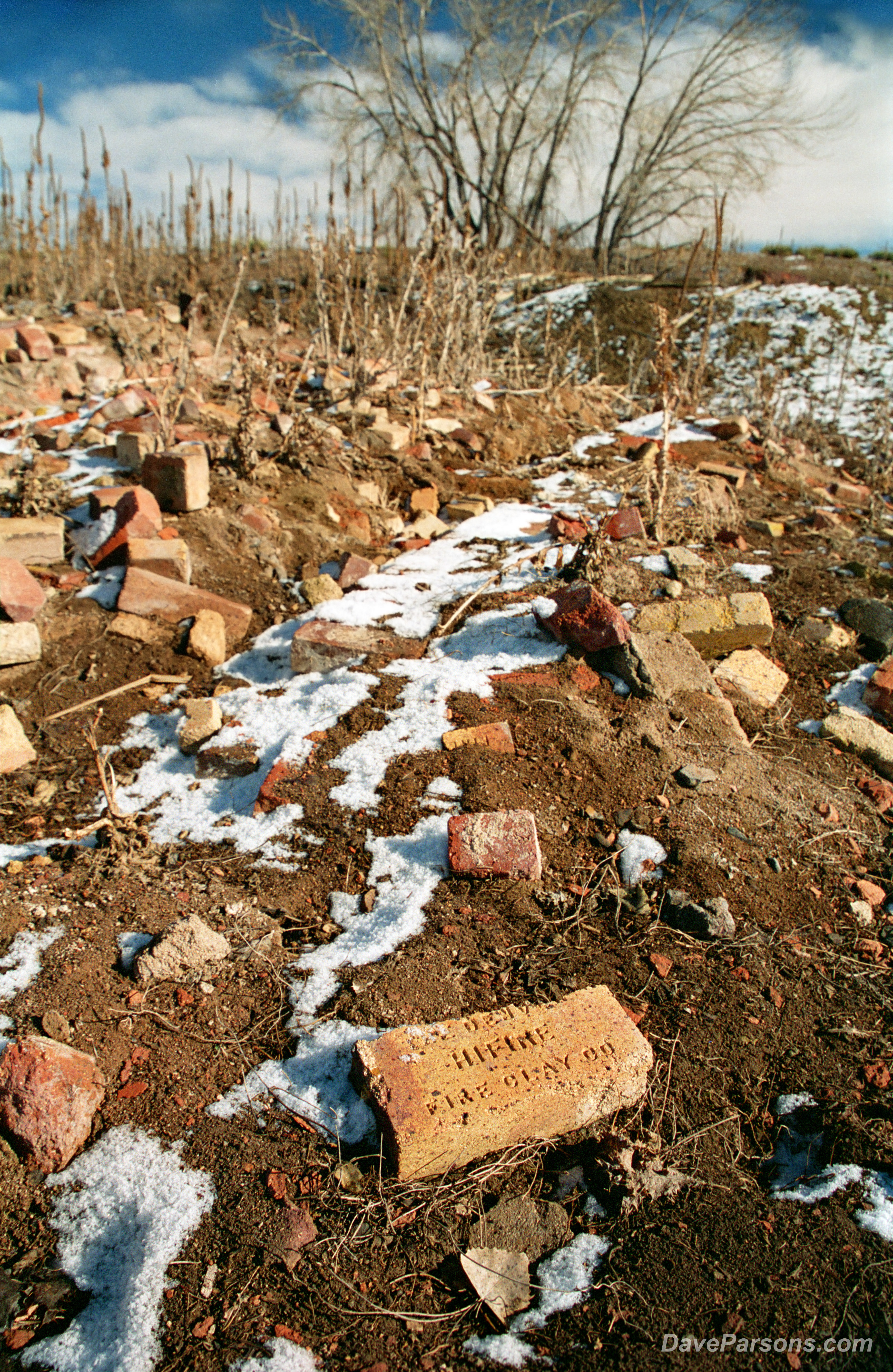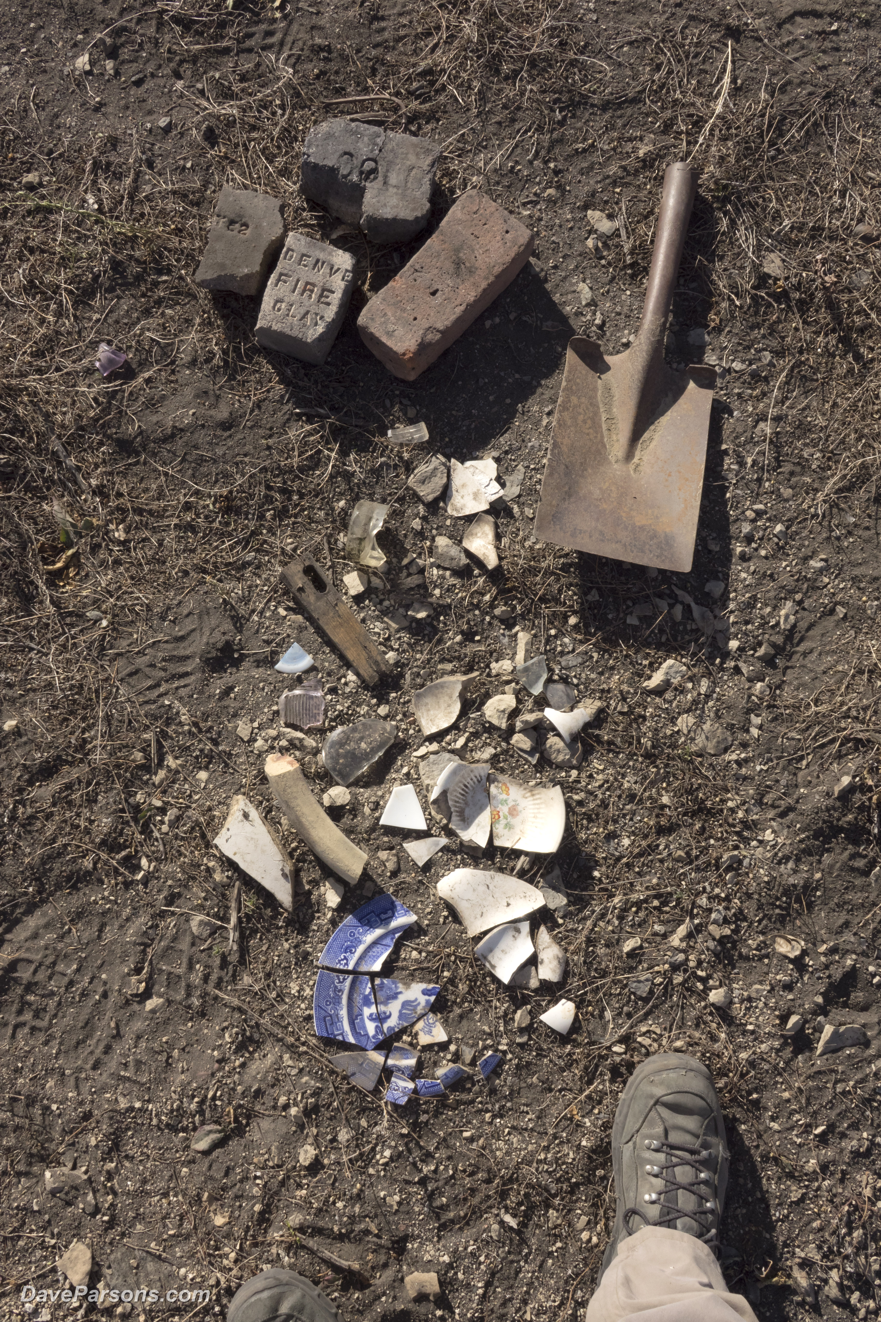 During a visit in November, 2025, kids and prairie dogs had dug up 1920s - 1940s artifacts throughout the area, making trails, dirt bike jumps and burrows. The heavy steel girder was likely part of the superstructure of the mine. Glass plates, china and huge crock shards littered the area. Pieces of the blue plate were from Allertons Ltd. of England. The "Blue Willow" pattern, a ceramic transferware dates from 1929 to 1942. The straight edge, rectangular, but small shovel could have been used to clean the clinkers or slag out from under the boiler. Various bricks also dotted the area including red construction bricks, Golden and Denver Fire Clay Company bricks. David Parsons photos |