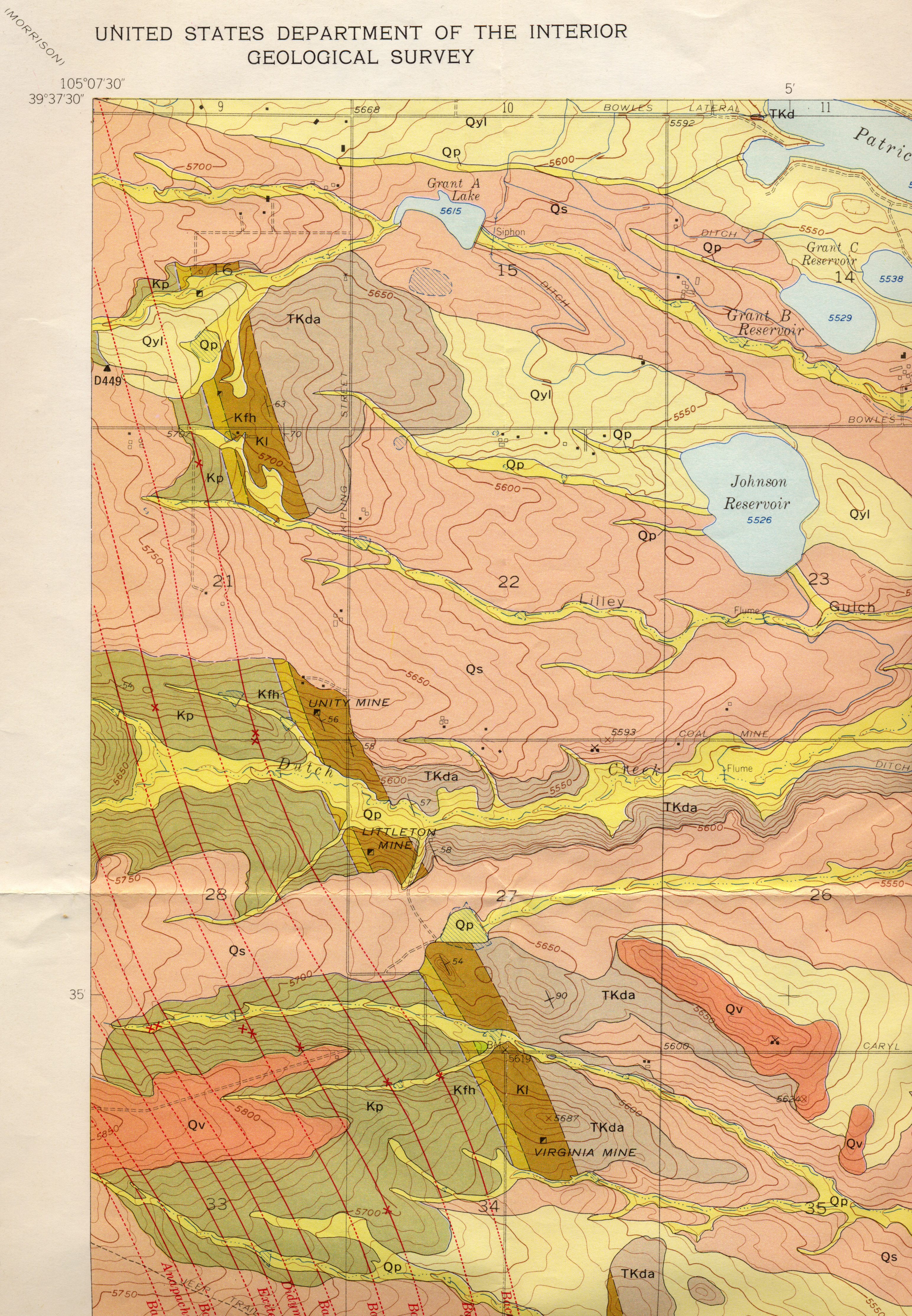 (Kl - Laramie formation, Kfh - Fox Hills sandstone, Kp - Pierre shale, Qs - Slocum Alluvium, Qv - Verdos alluvium, TKda - Dawson arkose, Qp - Piney Creek alluvium, Qyl - Younger leoss) - Map from 1957 "Geology of the Littleton Quadrangle Jefferson, Douglas and Arapahoe Counties Colorado." - Parsons Collection |