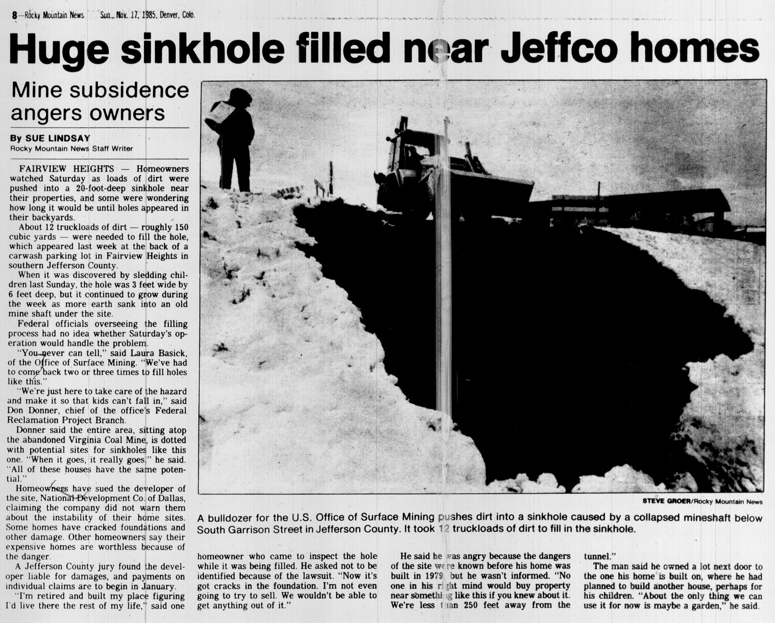 In 1981 Jefferson County officials designated a geological hazard zone in the area of the mine, meaning that no additional development could take place." (November 6, 1985 - RMN)