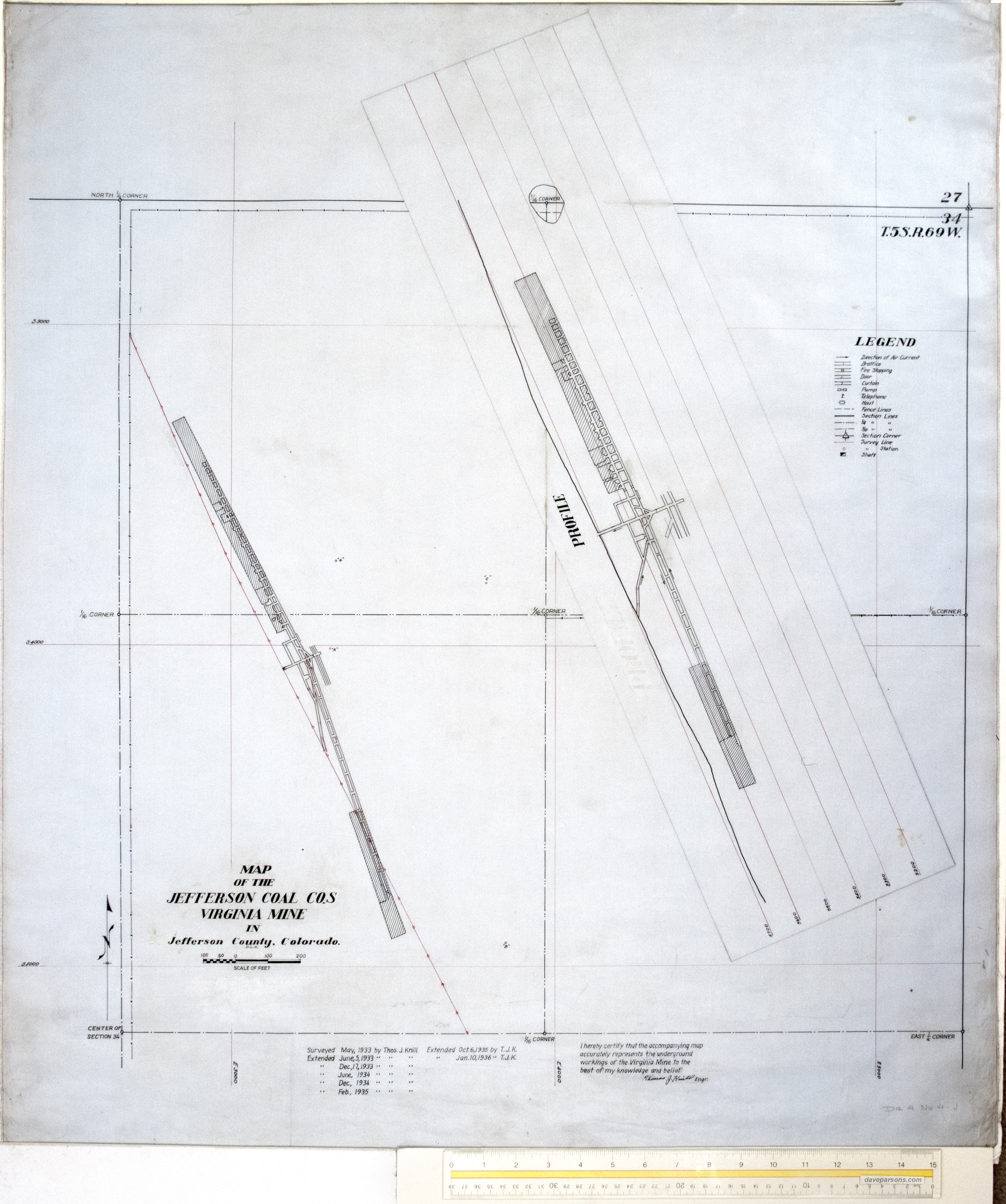 Original hand drawn 1933 technical schematic of the Virginia Coal Mine by Registered Engineer Thomas J. Knill and updated in 1934-1936. Despite being incomplete without extensions up to 1939, the drawing still gives an idea of the area of the mine. From Parsons Collection (another timely discovery found on eBay, November, 2025 while writing this story) |