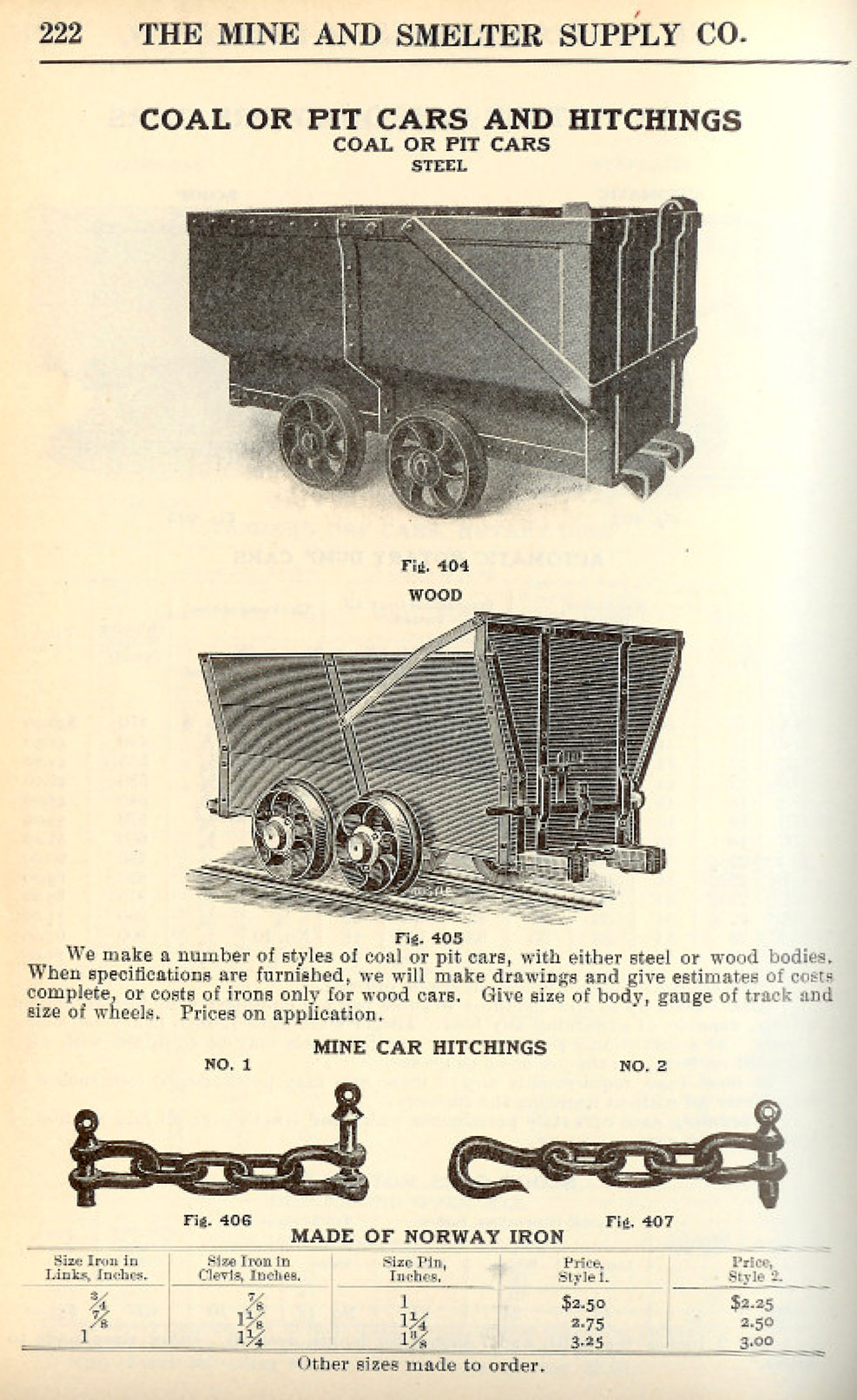 - 1 4x10 Air Receiver; 35 Feet 5-8" Air Hose; 80 Foot Conveyor Chain; 4 Sprocket Wheels; 4 Boxes; 700 Feet Sheet Iron in Bins; 300 Feet Angle Iron in Bins; 2 3" Flat Boxes; 1 18" Sprocket; 1 6-ft pc. 2-7/16" Shaft; 2 Take-up Boxes; 2 Bearings, 2- 7/16", 1 Screen and Shaft; 2 Bearings, 3-7/16"; 1 8 tooth Sprocket; 1 12 tooth Sprocket; 1 Piece Shafting; 2 Sets 30 lb. Frogs & Switches; 30 30-ft Splice Bars; 20 1/4" Anchor Bolts; 14 Ft. 4 1/2" 4-ply Belt; 1 Pulley 20" by 5 1/2 x 2"; 102 Ft. 1 1/2" Pipe, 219 Lb. 12-gauge iron; 2 6" Flange Unions; 1 7" Elbow; 6 Ft. 7" Pipe; 1 Hoist and wire rope together with all grease cups, lubricators and all fixtures complete and steam pipe from boiler to hoist (see photo below); 13 Pit cars; 1 Lumber car; 2 30 lb. switches; 30 Conveyor Buckets; 1 Automatic Tipple Dump; 5 Rollers, 1 Concave Roller; Adjustable stock and dies; 1 Pipe Cutter; 1 Jack Hammer; 10,540 Pounds of 30 lb. rails