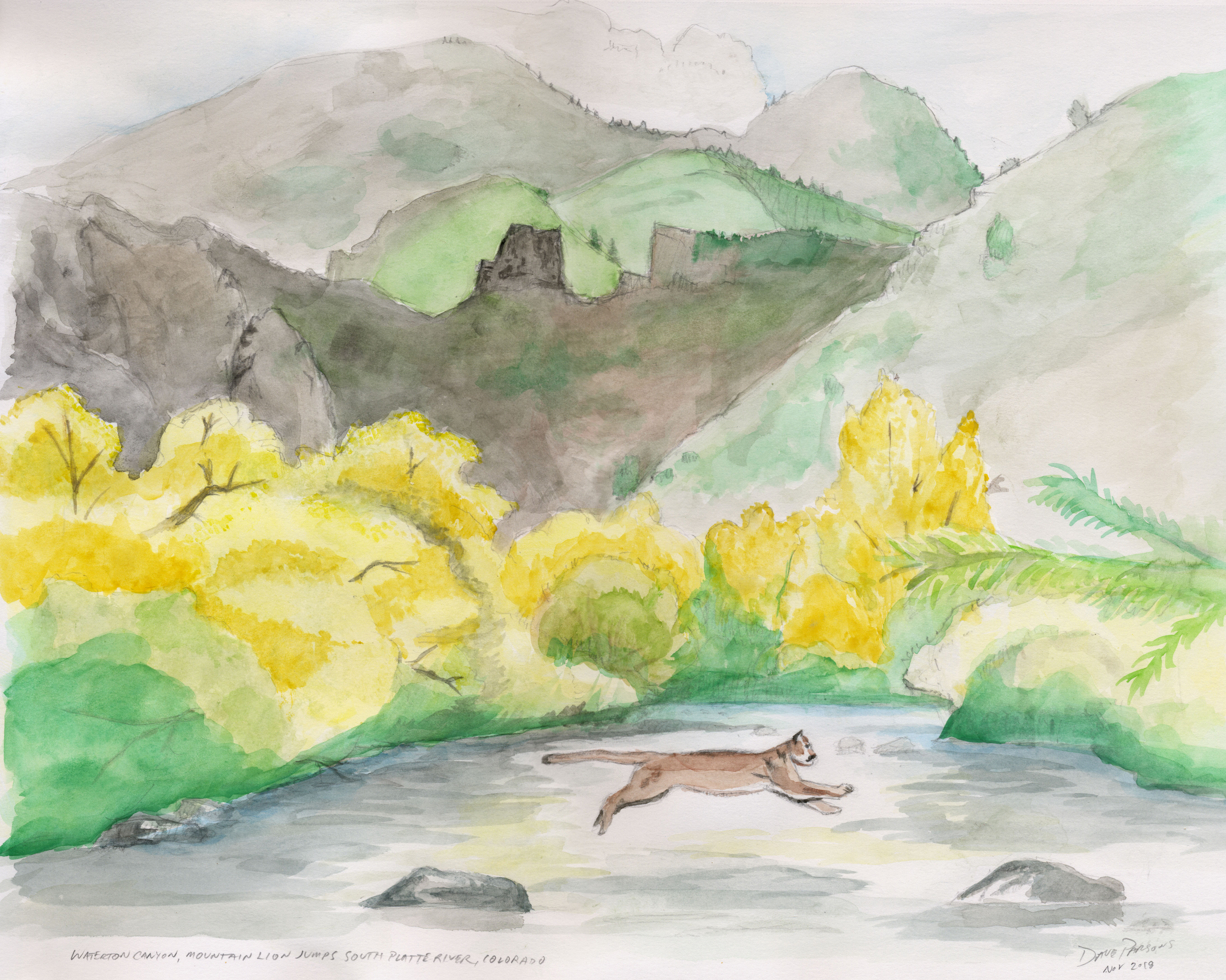 Colorado’s South Platte River Valley September 20, 2020 Photos, artwork and text by Dave Parsons On the Run Rocks and dirt rolled and slid down the steep hillside as bighorn sheep climbed wildly up towards the cliffs. Running in a line, their white rear ends converged on a high, rocky point in the canyon. Bunching up and bumping into one another like jockeying race horses, the group of over twenty stopped in a tight cluster and began looking back wildly in the direction they had just run. Three young males with curving horns stood among a majority of juveniles, lambs and females as they continued to move higher along the canyon walls. In confusion, the group would backtrack not knowing who to follow or which direction to go. Undoubtedly, the scent of predator was wafting through the air, changing direction randomly as hot and cold currents blew up and down the South Platte River.