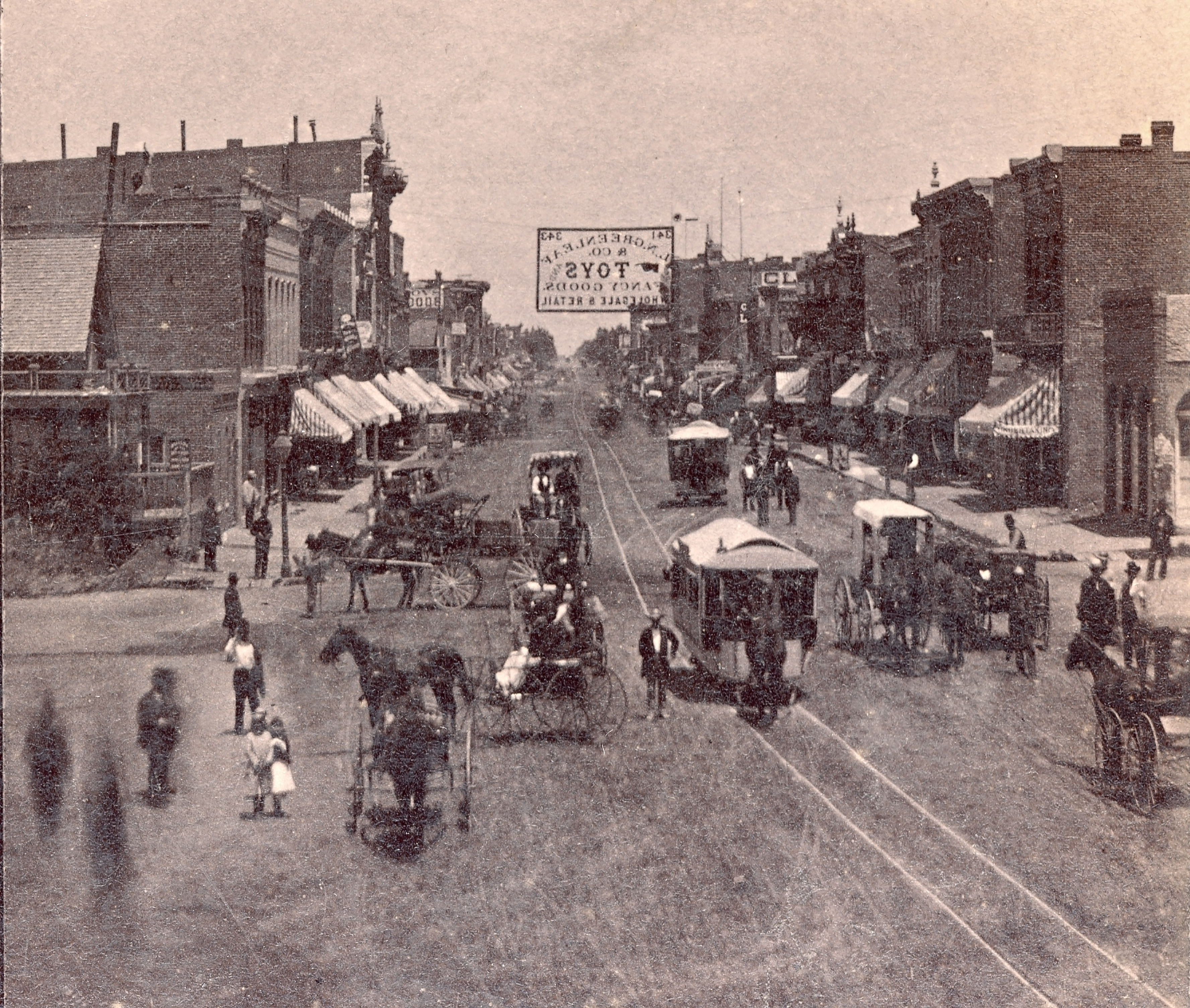 Wagons, carriages, pedestrians and two horse-pulled trolleys roll down a bustling Larimer Street past brick shops with striped awnings about 1878. The downtown Denver steroeoview photo by Charles Witfle was taken from the Cherry Creek bridge looking northeast. Parsons Collection