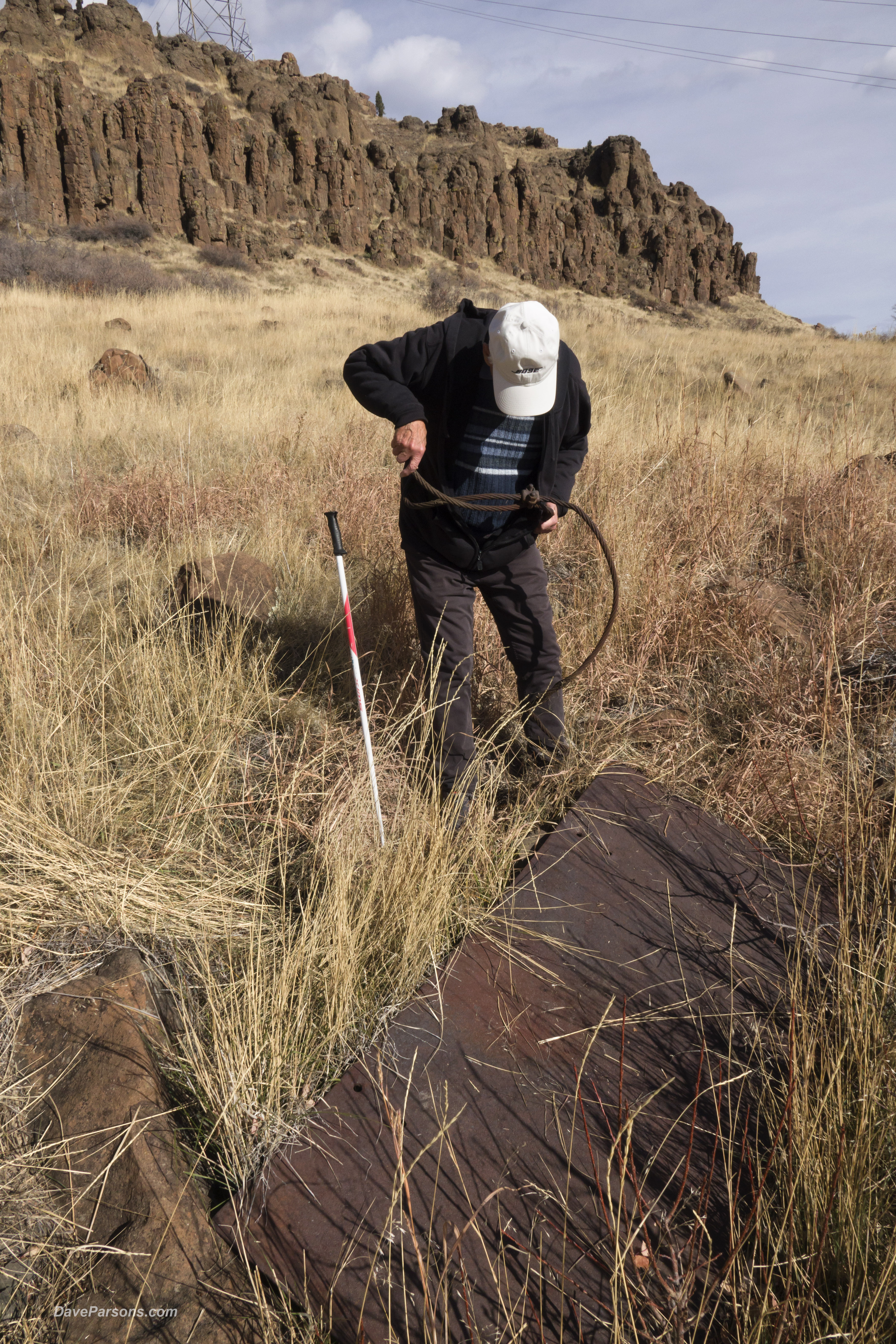 Climbing an ancient lava flow! Looking west towards Lookout Mountain over two decades earlier, on October 30, 2004, with the help of friends, I climbed the cliffs on the basalt covered south facing side of North Table Mountain adjacent to where stone was once quarried over a hundred years earlier. Little did I realize the geology and human history I was climbing on! Claire O. photos - Parsons collection