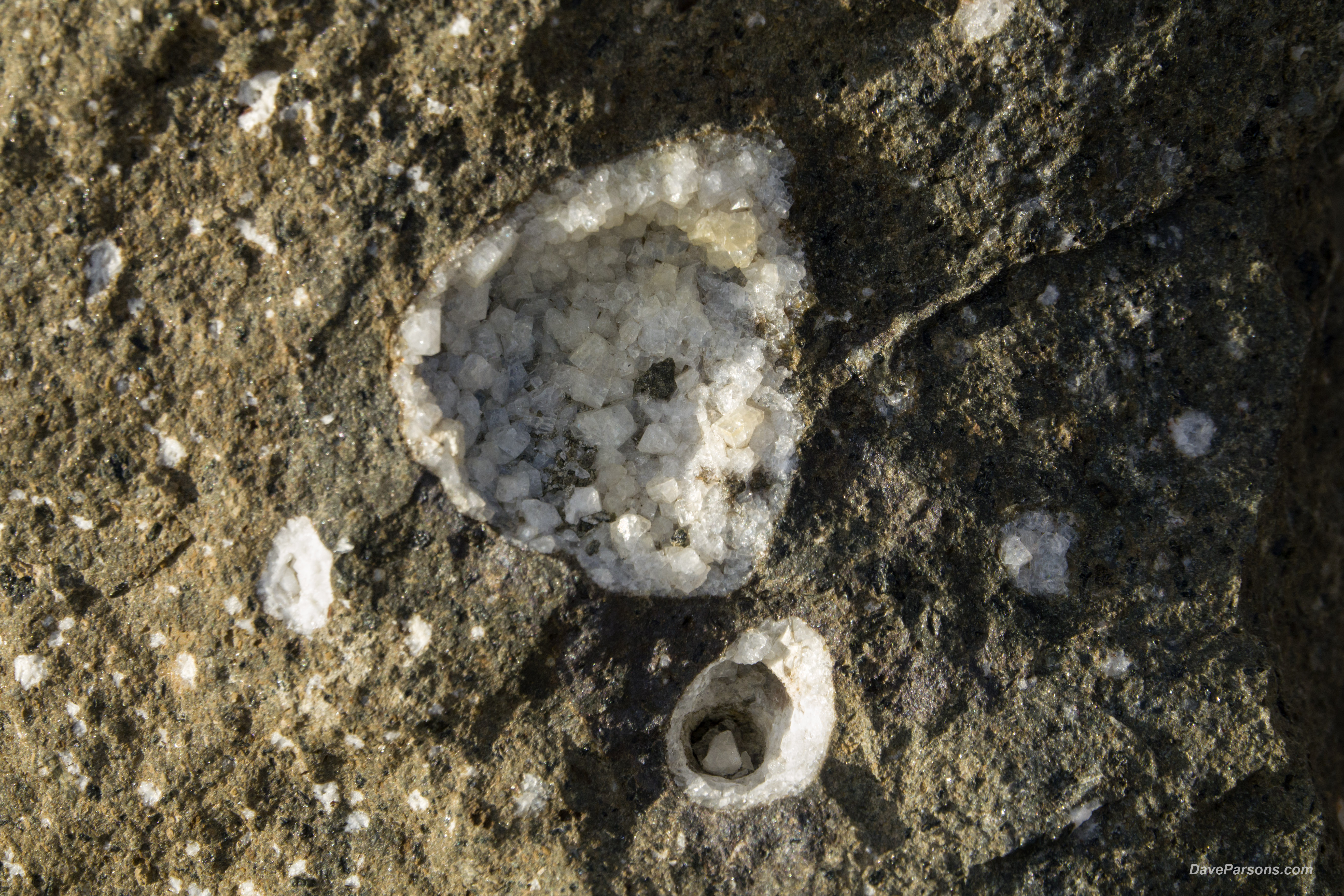 Voids, like this two inch wide bubble with an analcime mineral lining formed in a massive boulder in the ancient lava flow. Known as "vugs," they contain Zeolite minerals, geode like crystals in a hollow within the brown basalt. Arthur lakes and his Colorado School of Mines students collected samples from this quarry in 1874. Parsons photo