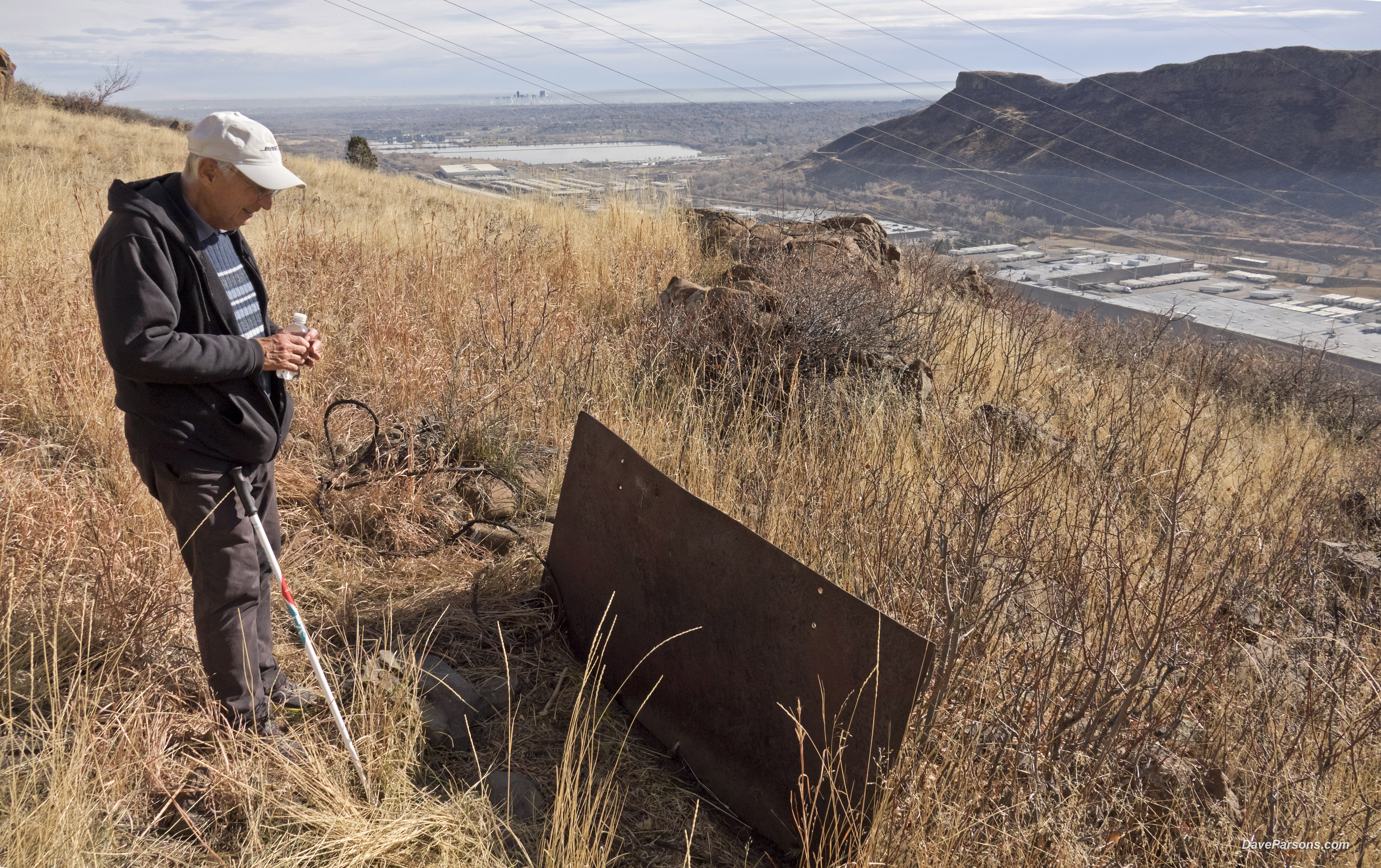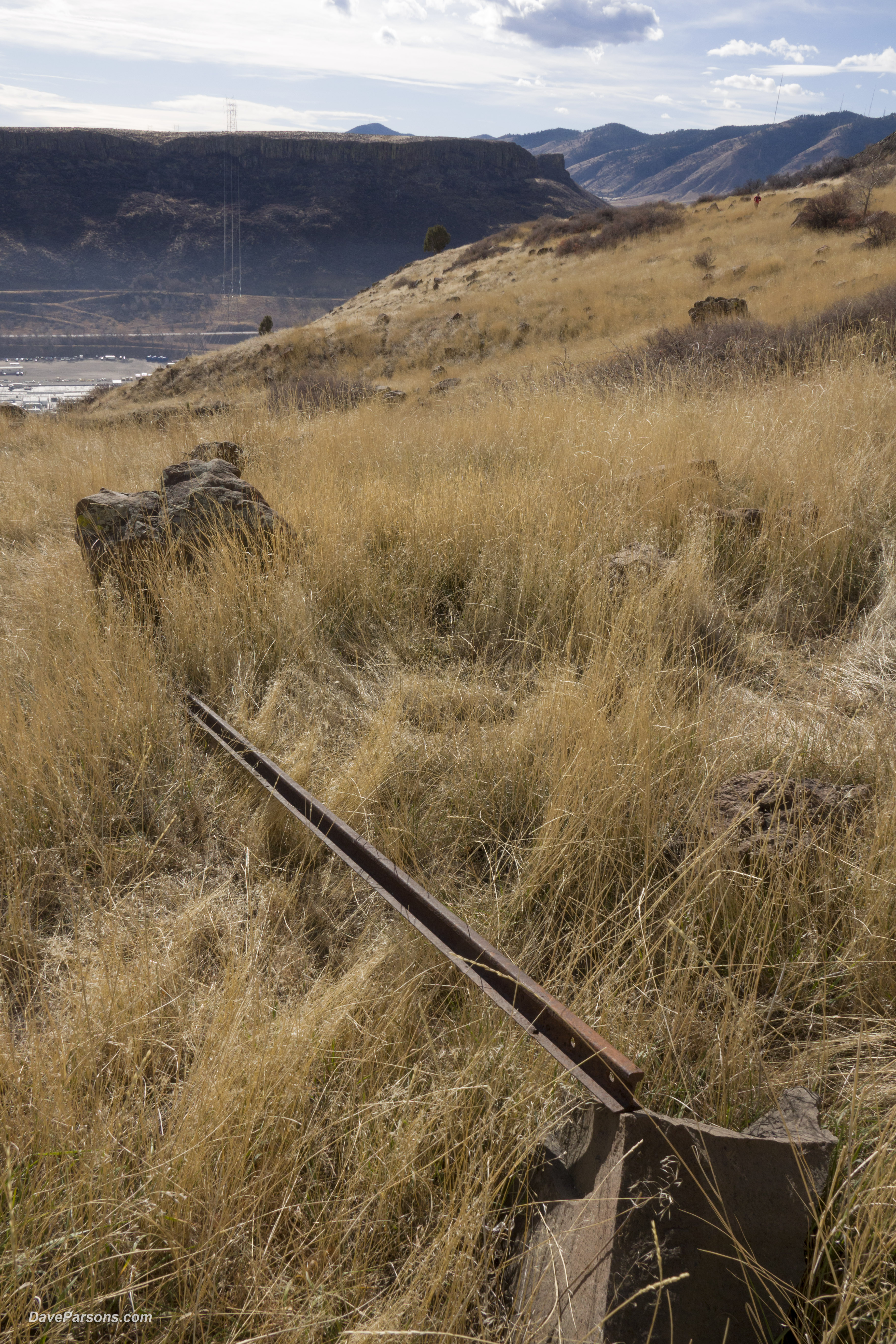 Walking the railroad grade of the Tramway Quarry with ancient lava flows along the cliff tops of North Table Mountains. Downtown Denver and South Table Mountain stand in the distance.