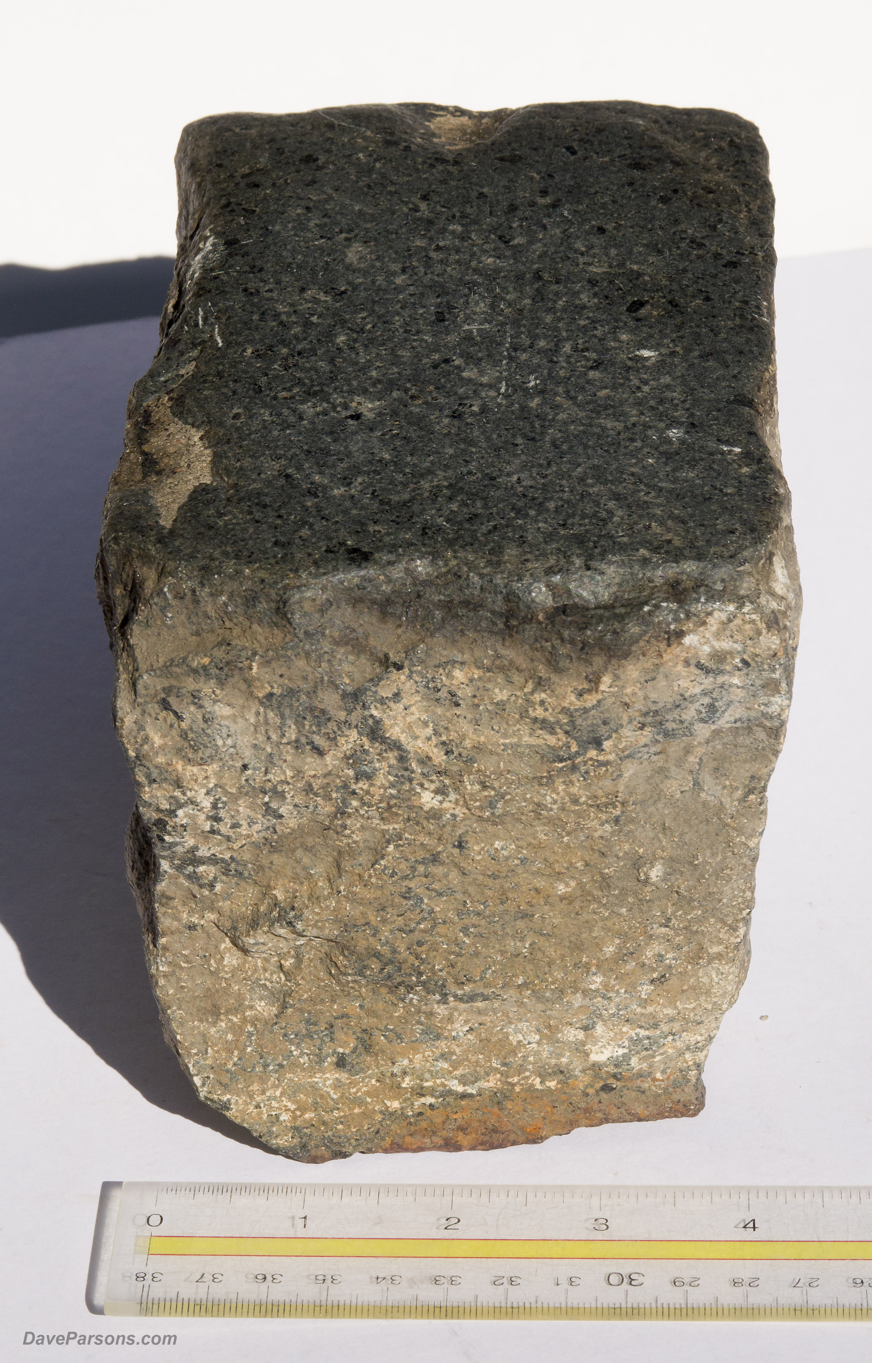 Polished smooth on top from decades of horse hooves, carts, pedestrians and vehicles, the heavy stone paver collected on March 30, 2024 from Tremont Street construction in Denver, weighs 12 pounds and is cut in a trapezoidal shape. It's dimensions are 4x7 inches on top and 5 inches tall. The brown basalt has magnetite inclusions and is indeed magnetic. Parsons photos