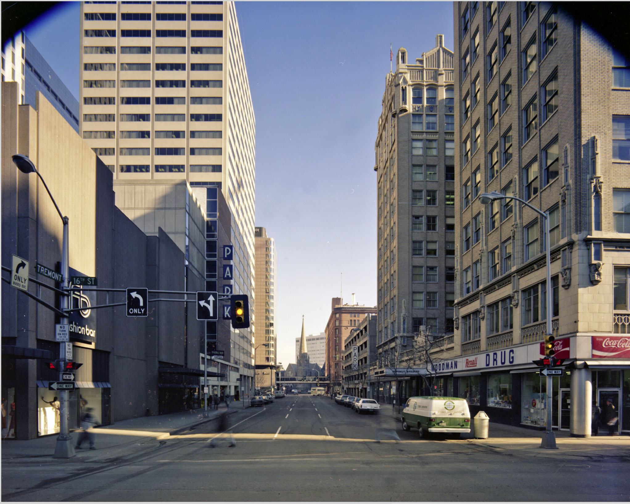 Photos of Tremont Street in 1971 and about 1900 - notice the center cable guides still remain in the middle of the tracks along with stone pavers in the earlier photo. Photos from the Denver Public Library Digital Collections.