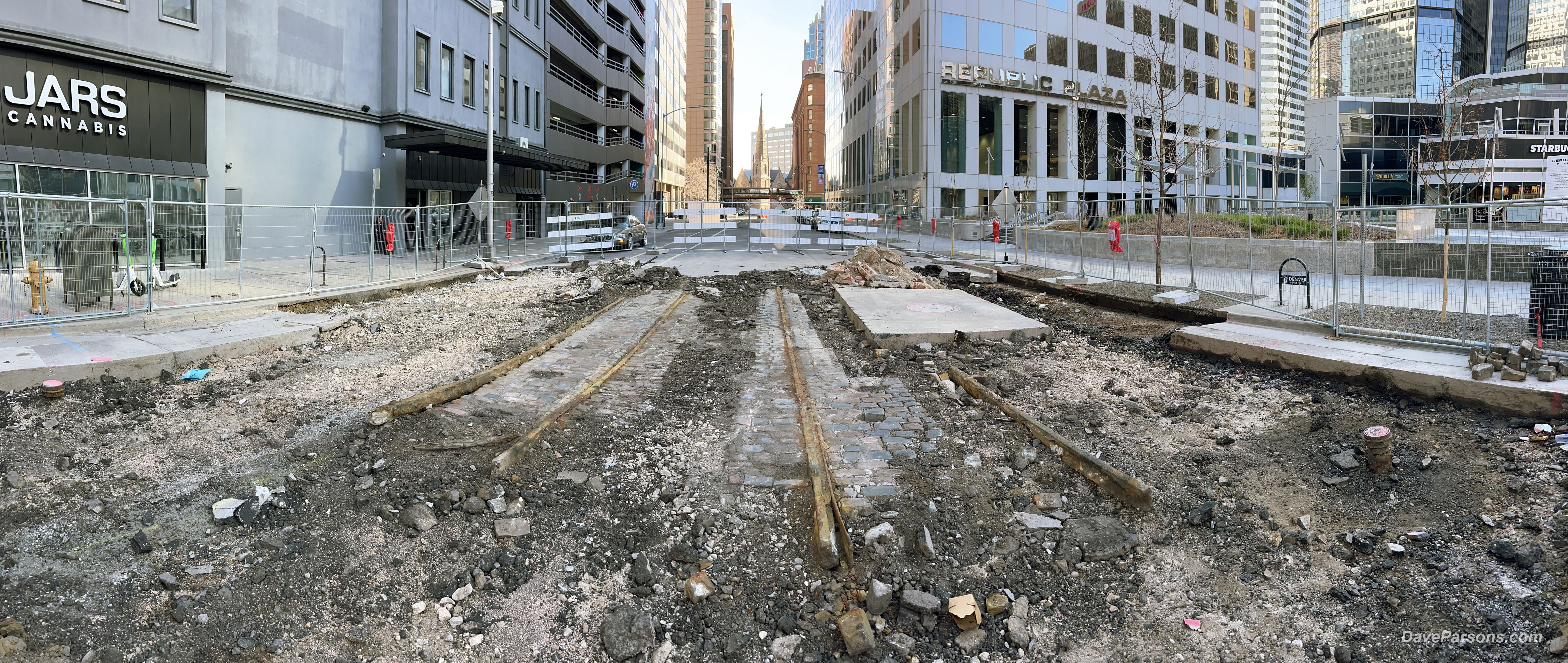 March 30, 2024 - Two pairs of tracks with basalt stone pavers in between at 16th and Tremont. The Brown Palace is in the distance on the right as is Trinity Methodist Church. Parsons photo