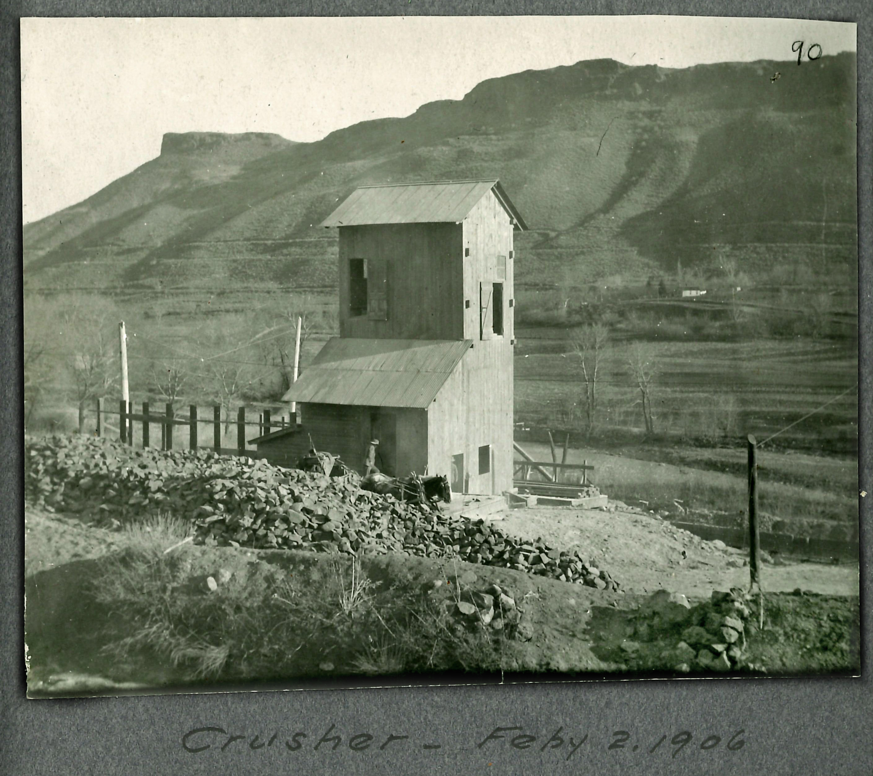 Built in 1906, the crusher stood on the north side of Clear Creek next to the parallel rail lines of the Colorado and Southern Railway and the Denver and Northwestern Railway. A trestle was also constructed for the incline to bring the ore carts safely over North Golden Road (West 44th Avenue) and the Colorado and Southern Railway. The tall, multi-story rock crushing plant with its rail siding for loading stone, also had a blacksmith shop with forge and sat about 100 yards away from the Weidman train station along the Denver and Northwestern Railway.