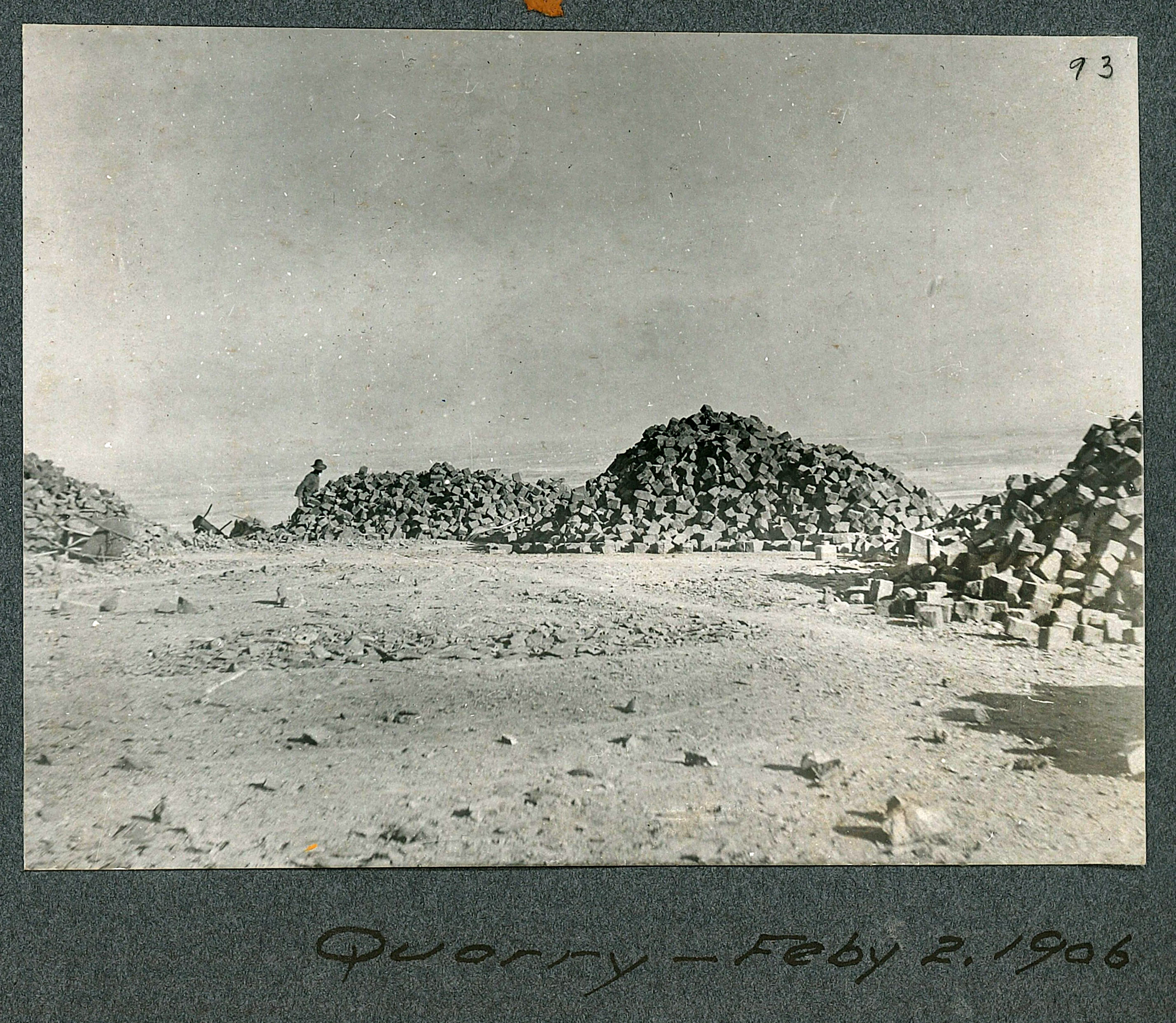 Looking west towards Lookout Mountain with the Colorado School of Mines and Clear Creek in the valley, workers break up rock in the basalt quarry about February, 1906. Large boulders, blown up with dynamite from the cliff side were broken up and shaped into rectangular pavers. Finished blocks were loaded on ore carts, rolled to the top of the tramway where another cart was filled and carefully rolled down the mountain. Notice the small rail spur lines to each boulder area.