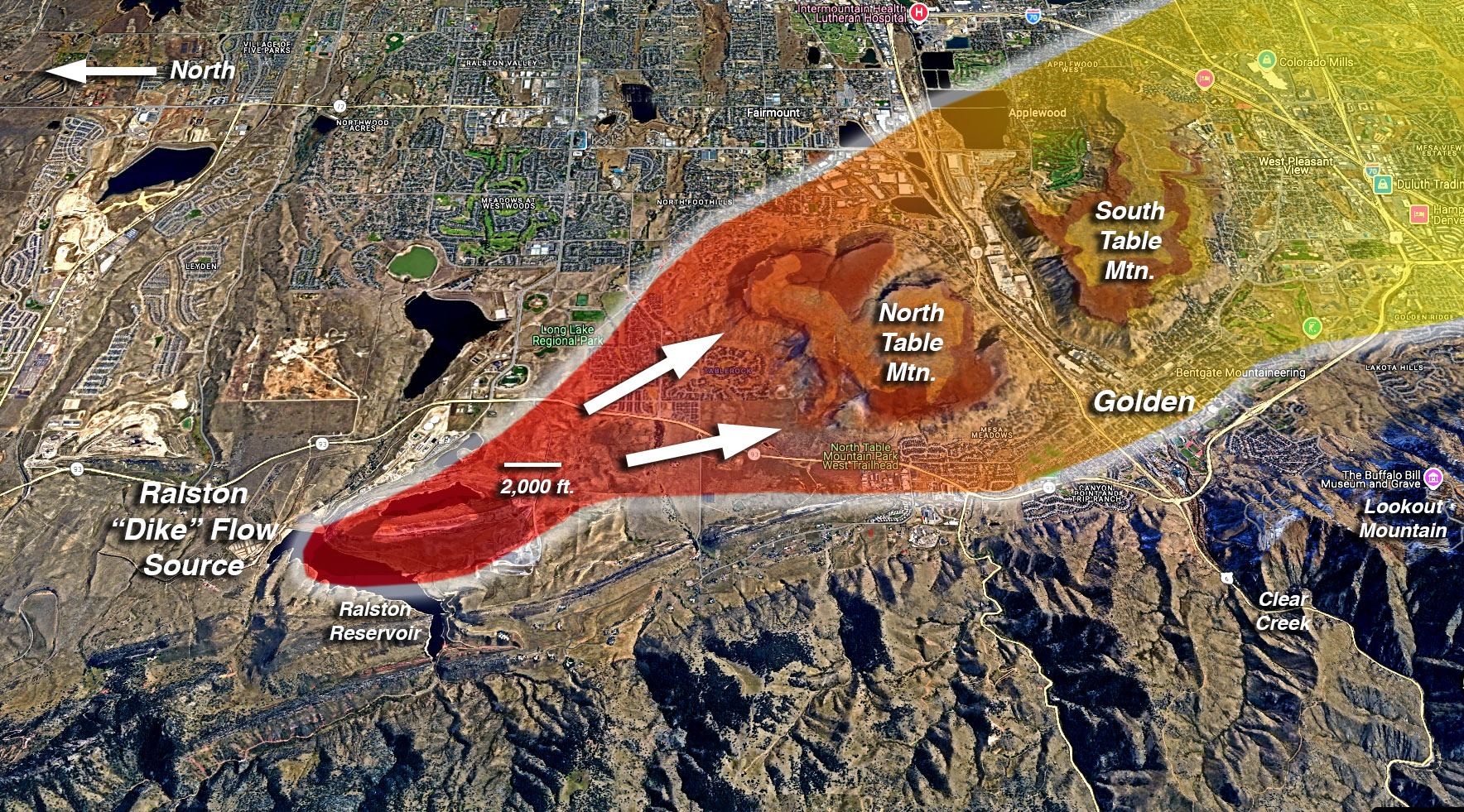 "As suspected by geologists since the late 1800s, a volcanic vent complex at Ralston Dike, about two miles north of North Table Mountain, is the likely source of the Table Mountain volcanic flows. The outer part of Ralston Dike is 65.4 ± 0.2 Ma old, an age compatible with Flows 2 through 4 on North Table Mountain. Also, the basalts at Ralston Dike are the same composition as the TableMountain basalts. The flows apparently came up along the subsurface trace of the Golden Fault during the Laramide Orogeny. Ralston Dike is more correctly called an exhumed volcanic plug. That is, it did not form a large volcano or an underground dike per se. The small cone where the vent came to surface was stripped away by erosion long ago, leaving only the eroded plug as the volcanic remnant. The lava flows from Ralston Dike flowed across the ancient landscape in a southerly direction toward present-day North and South Table Mountains, filling shallow channels of pre-existing rivers and streams. (Golden Rocks page 25)