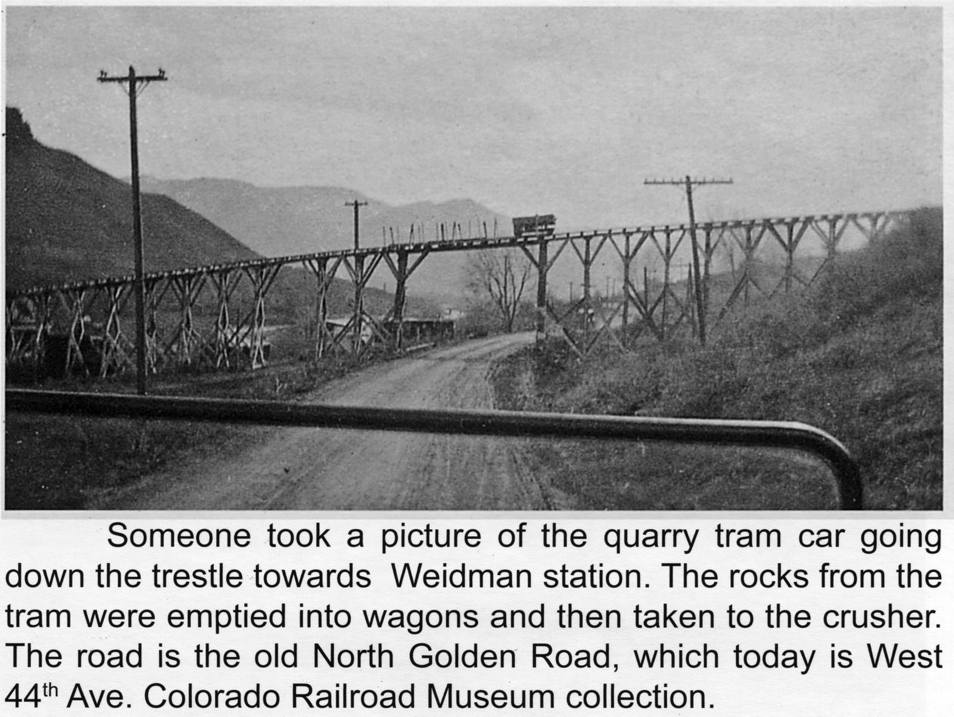 From about 1907 to 1923, the Denver Tramway Company ran a pair of small, cable driven rail cars full of basalt from the Tramway Quarry, down the incline and across the small trestle over a dusty North Golden Road (West 44th Ave.) and Colorado & Southern Railway to the crushing building constructed in 1906. Photo from Colorado Railroad Museum, Denver Street Railways Volume Three