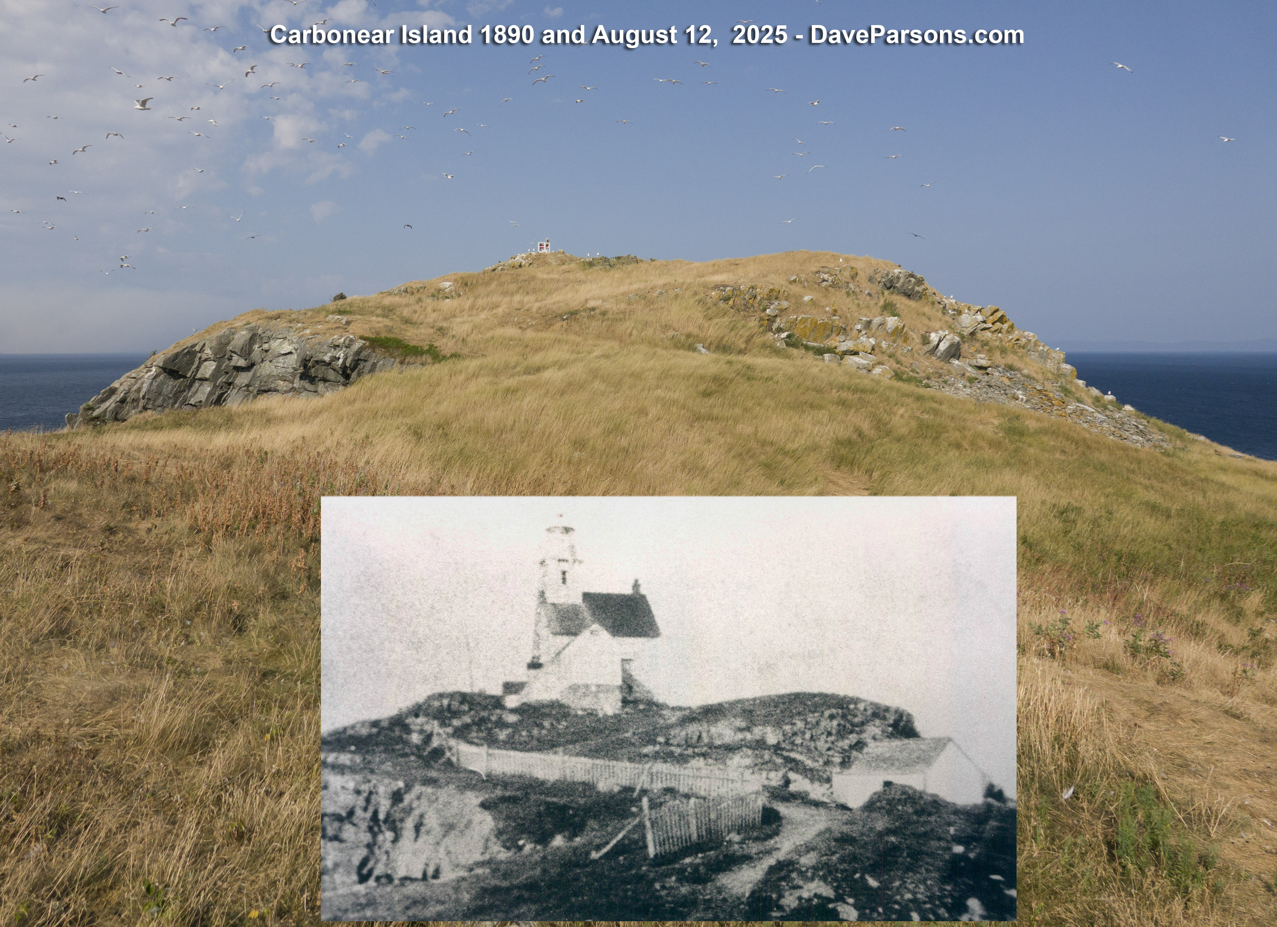 Taken close to where the 1890 photo was taken, today the spot houses the automatic lighthouse and lots of seagulls in 2025. B/W Photo from Memorial University of Newfoundland.